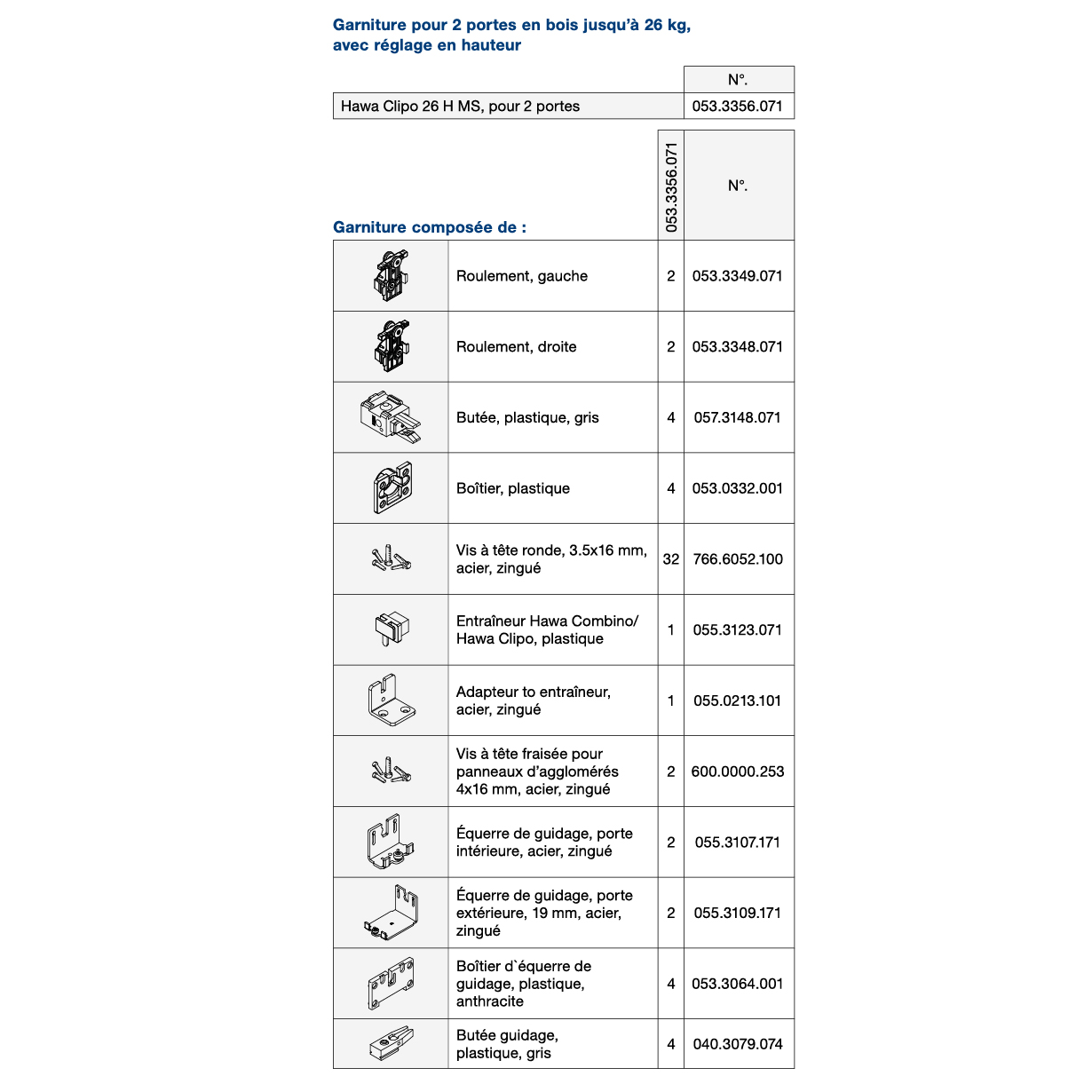 Pour portes d'armoire coulissantes entrant dans le corps en bois jusqu'à 26 kg, dimensions porte (largeur x hauteur) max. 1000 x 2200 mm,