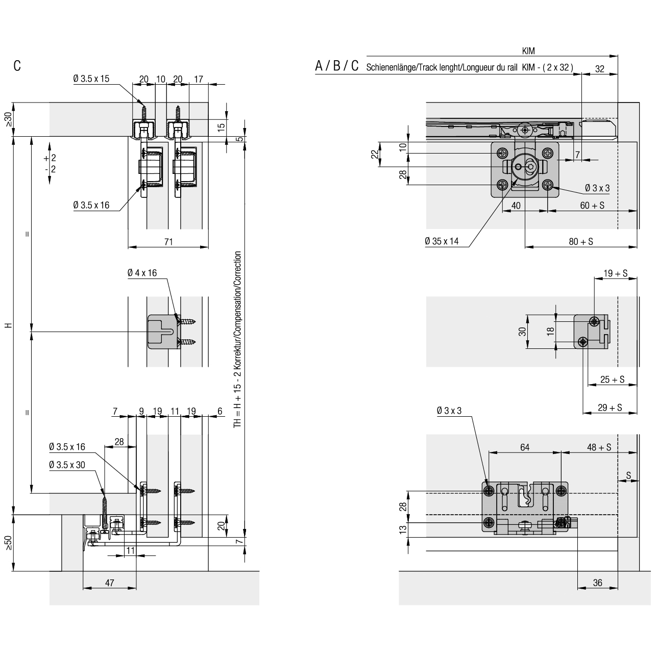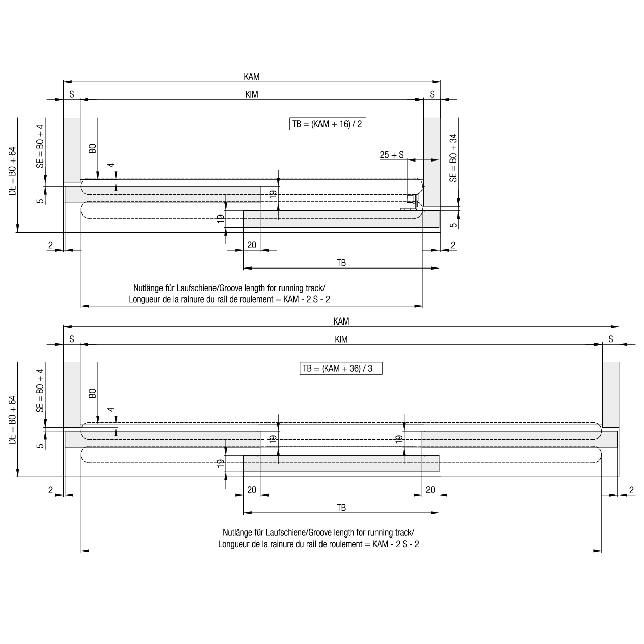 épaisseur de porte 19 mm, les rails de roulement sont rainurés, aucune rainure dans le fond, chariot à clipser, sans rails de roulement, sans accessoires