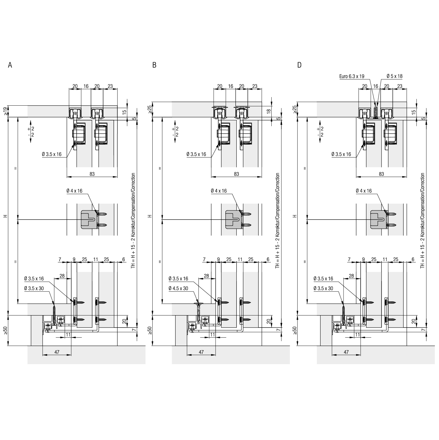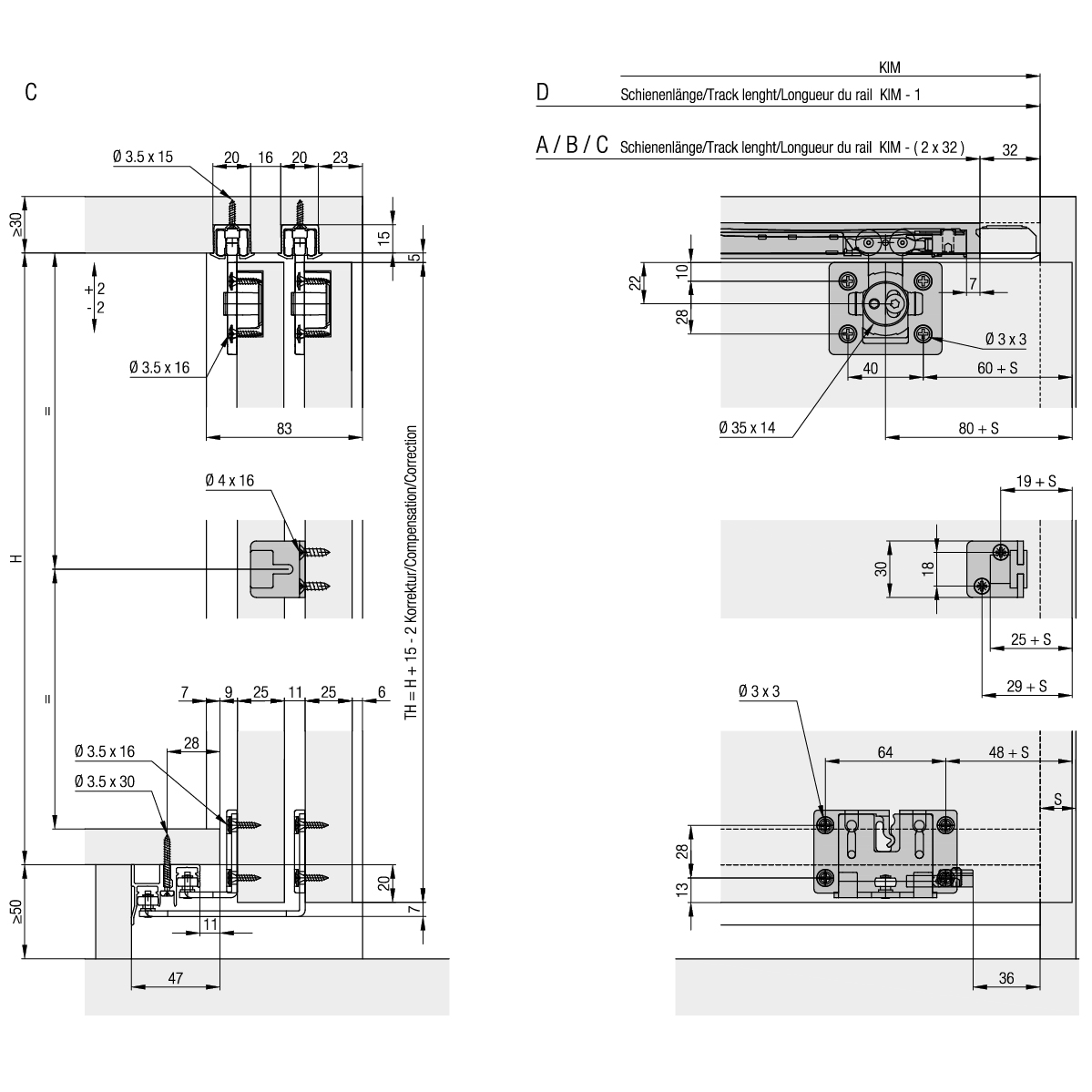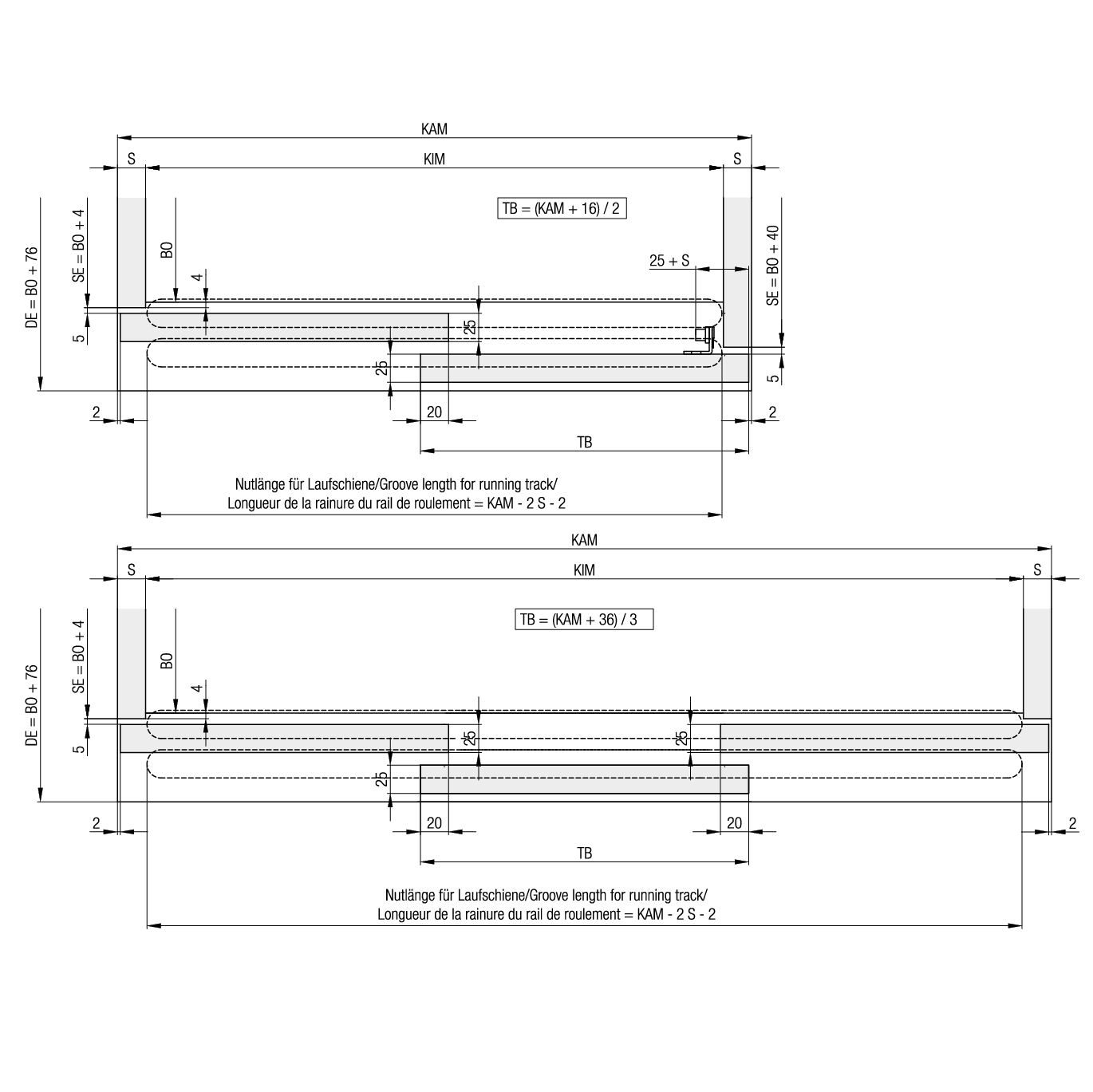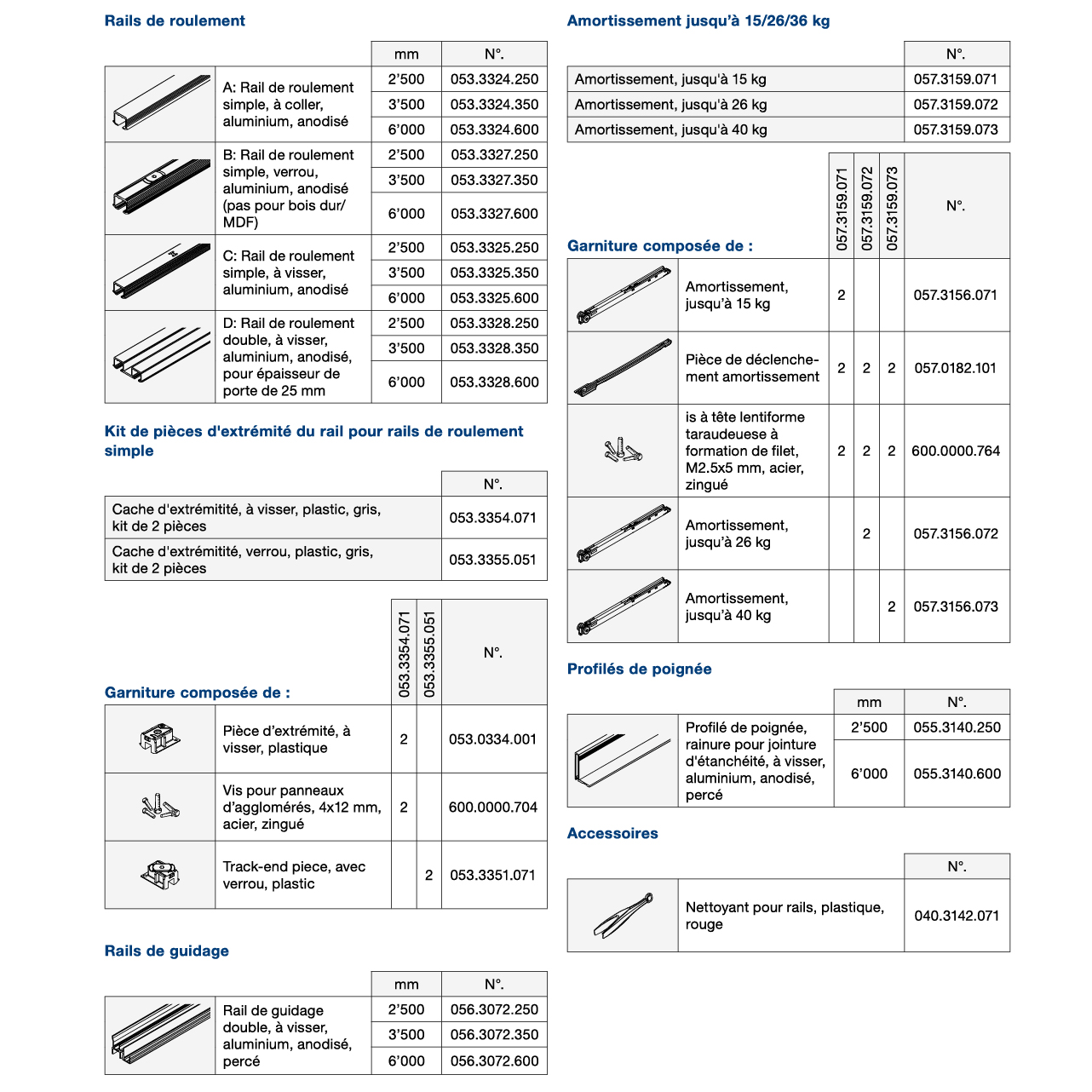 Pour portes d'armoire coulissantes entrant dans le corps en bois jusqu'à 36 kg, dimensions porte (largeur x hauteur) max. 1000 x 2400 mm, épaisseur de porte 25 mm, les rails de roulement sont rainurés, aucune rainure dans le fond, chariot à clipser, sans rails de roulement, sans accessoires
