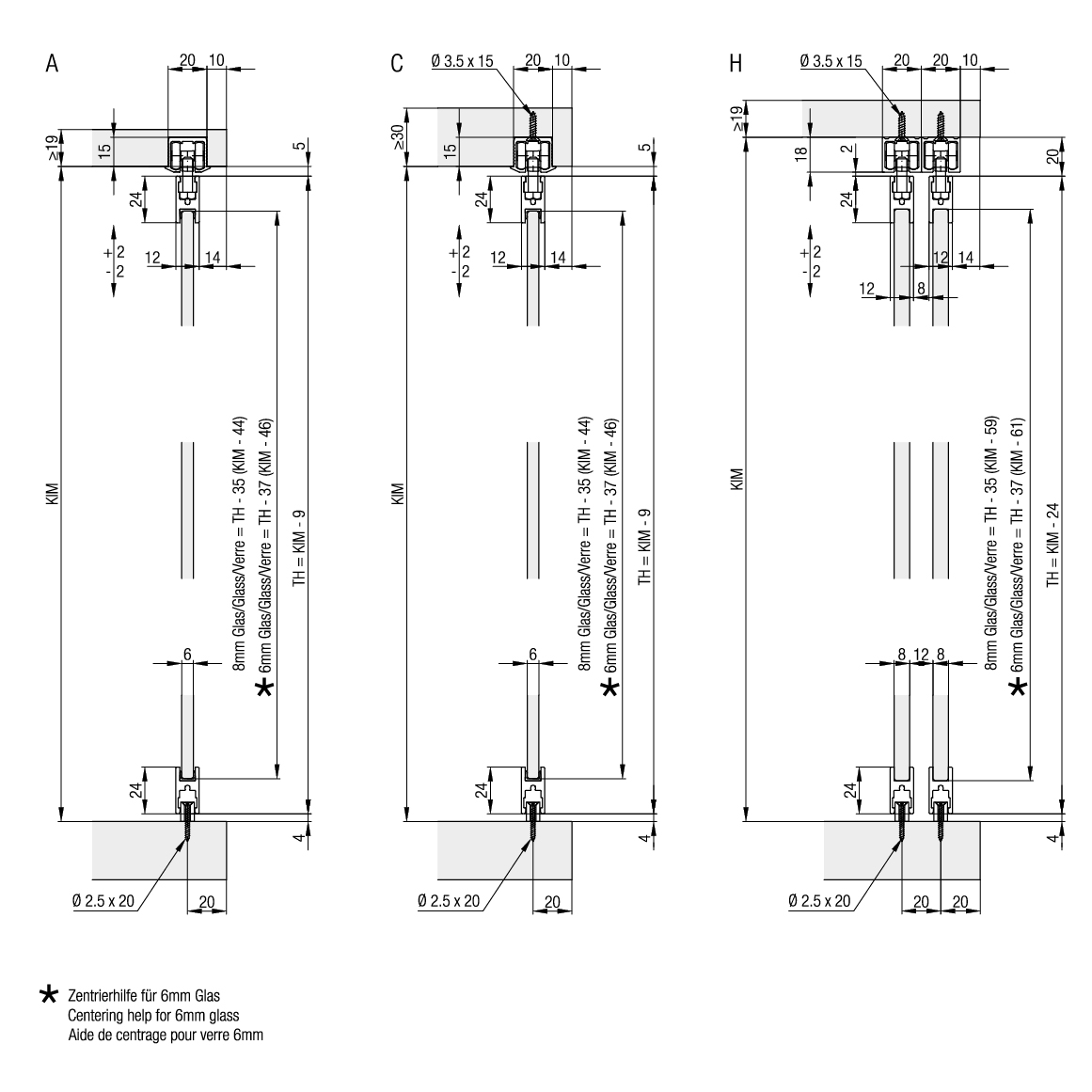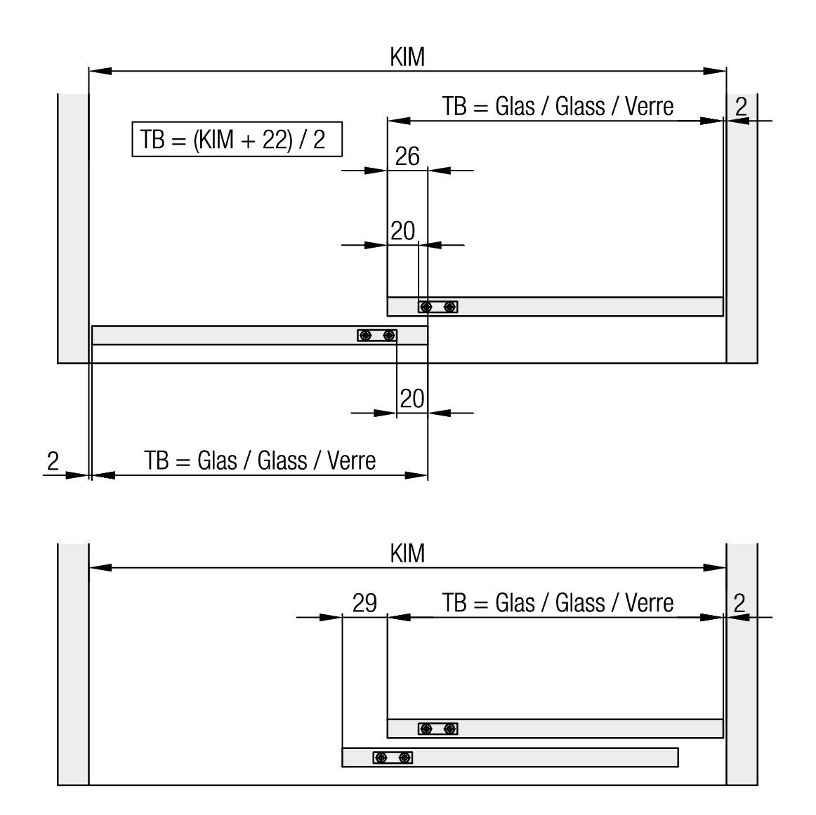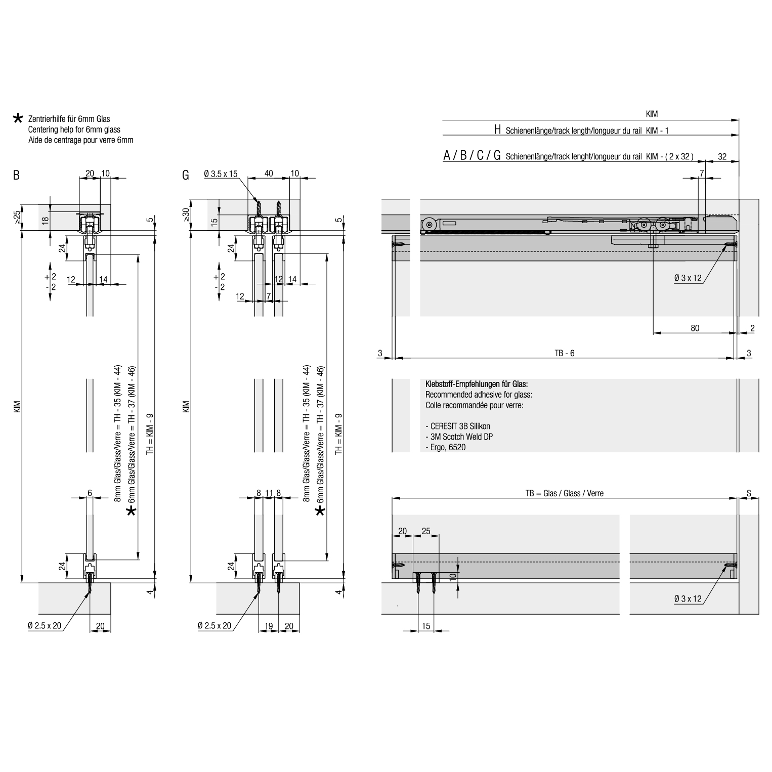 Pour portes d'armoire coulissantes entrant dans le corps en verre jusqu'à 36 kg, dimensions porte (largeur x hauteur) max. 1000 x 2000 mm, épaisseur de verre 6 - 8 mm, rails de roulement avec support de vitre fixe, montage mural ou au plafond, avec chariot de roulement pour montage invisible, profil de fixation 24 / 12 mm, sans rails de roulement, sans accessoires