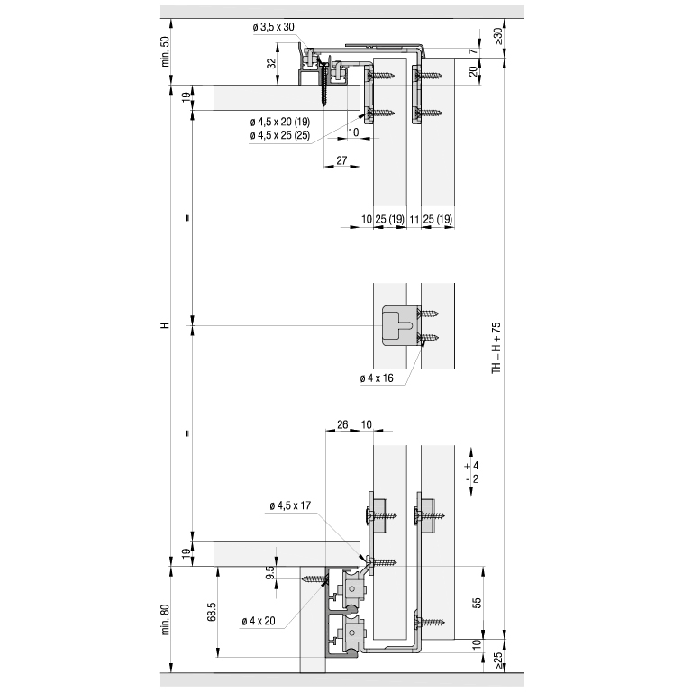 Pour portes d'armoire coulissantes en saillie en bois jusqu'à 50 kg, dimensions porte (largeur x hauteur) max. 1400 x 2400 mm, épaisseur de porte 19 ou 25 mm, avec réglage en hauteur de l'excentrique + 4 mm / - 2 mm, le système à roulement en bas avec support du poids total de la porte permet une conception d'armoire avec une faible épaisseur de matériau, coulissement léger et silencieux avec EKU Galet de Confort, sans rails de roulement et de guidage, sans profil de recouvrement, sans accessoires
