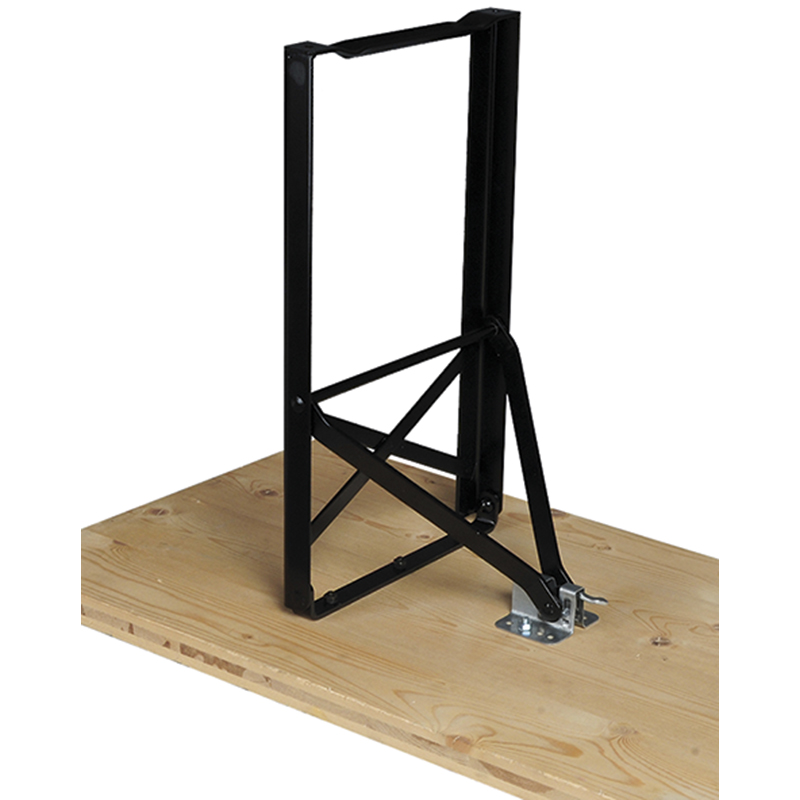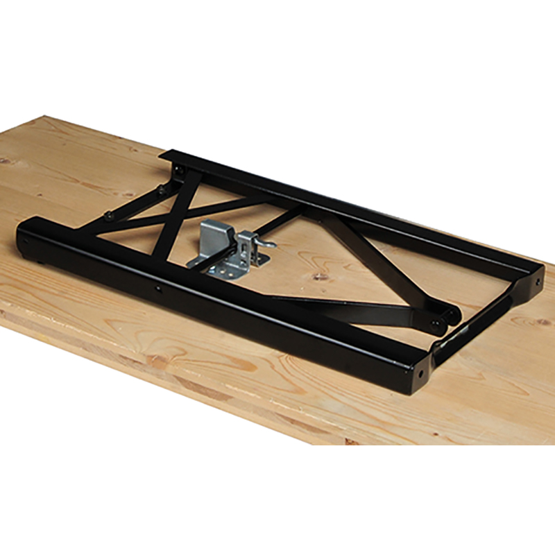 - Les ferrures de banc rabattables montées sont bloquées par une fermeture de sécurité en position pliée et dépliée. Pour les bancs empilables, une baguette de bois de 40 mm d'épaisseur est montée des deux côtés.