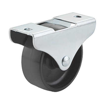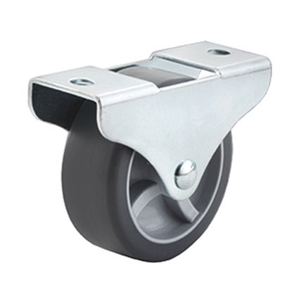 Boîtier feuille d'acier galvanisé, roue polyamide noir, avec palier lisse, dure pour sols mous comme moquette, ou roue en caoutchouc thermoplastique gris, avec palier lisse, souple pour sols durs comme parquet flottant*, laminés ou panneaux, résistance à des températures de -20° à +80° C