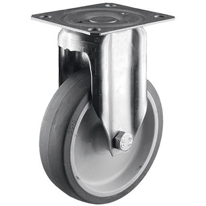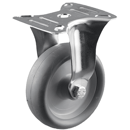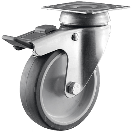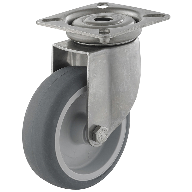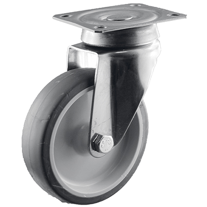 Boîtier inox, embout à chape avec double roulement à bille, bande de roulement en caoutchouc thermoplastique gris, sans traces, corps de roue en polypropylène avec palier lisse, résistance à des températures de -20° à +70° C