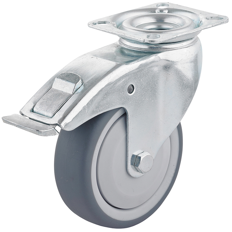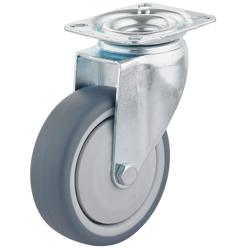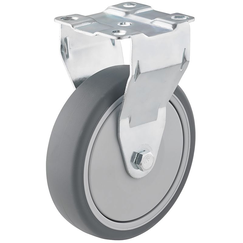 Boîtier feuille d'acier galvanisé, embout à chape avec double roulement à bille, bande de roulement en caoutchouc thermoplastique gris, sans traces, essieu vissé, corps de roue en polypropylène avec roulement à bille et pare-fils,
