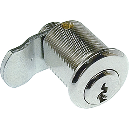 Cylindre laiton nickelé, utilisable d'un seul côté, pour boîtes aux lettres et petits récipients métalliques, avec fixation par écrou, avec pêne légèrement coudé, axe de 30 mm, course du verrou 90°, avec 2 clés dentelées