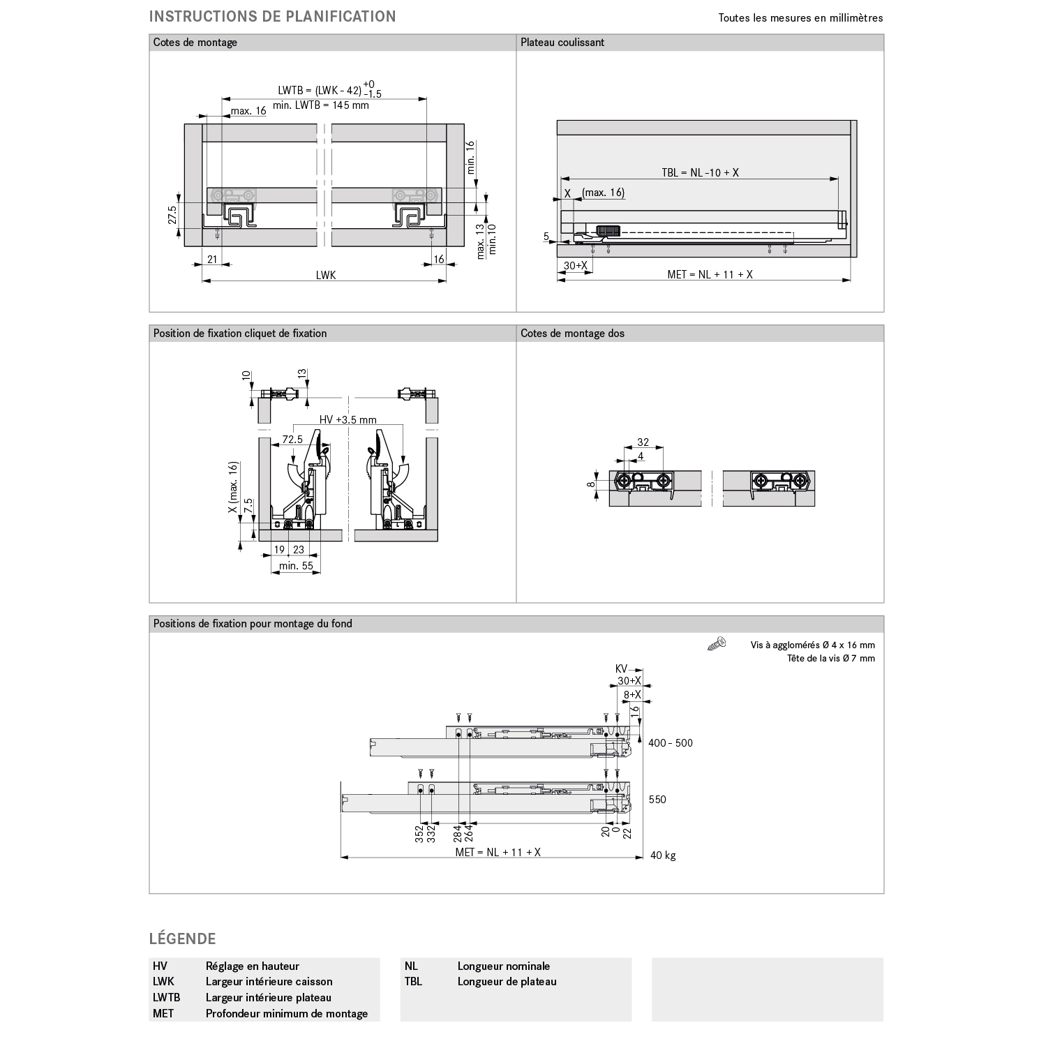 système de guidage escamoté pour tiroirs coulissants, extension totale avec déplacement synchronisé, arrêt automatique en continu du tiroir en cas de coulissement sur le guidage, réglage de la hauteur intégré et sans outil + 3,5 mm, montage sur le fond du caisson ou le plateau intermédiaire