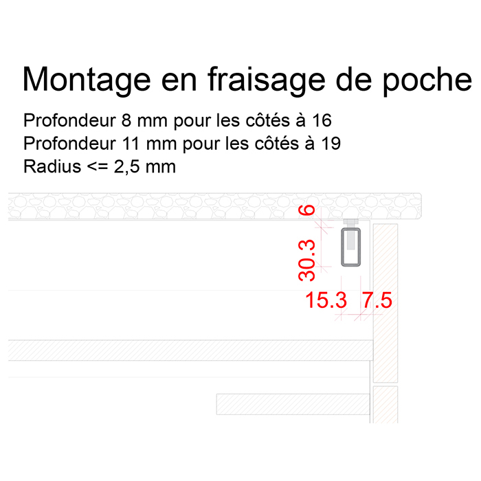 Inox, profil de support pour une meilleure stabilité du plan de travail de la cuisine autour de la plaque de cuisson, protection optimale en cas de charges lourdes, tolérance sur le plan de travail de la cuisine réglable à l'aide des vis de réglage, assure la ventilation des tables de cuisson à induction, montage en fraisage de poches, profondeur 8 mm avec 16 mm d'épaisseur latérale, 11 mm avec 19 mm d'épaisseur latérale , largeur x hauteur x épaisseur = 15 x 30 x 2 mm