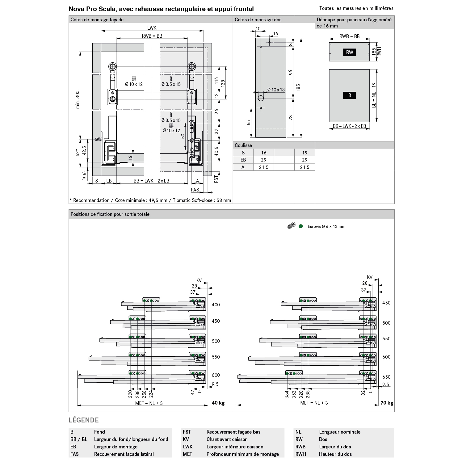 blanc, argent ou anthracite, stabilité optimale à hautes fronts, avec réglage de l'inclinaison de la façade intégré,
