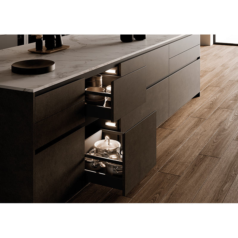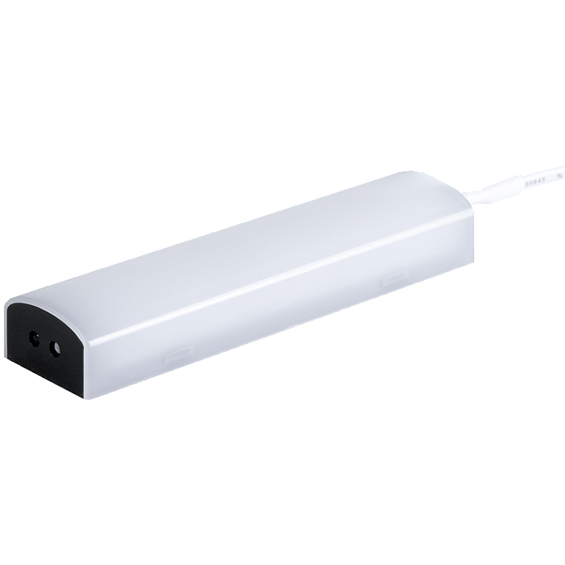 Leuchte mit geringen Abmessungen für die Innenbeleuchtung von Schubladen, Ausziehkörben und Küchenoberschränken mit Klapptür, wird seitlich am Korpus mit einer verdeckten Halterung installiert und ist mit einem Sensor für die automatische Ein- und Ausschaltung beim Öffnen und Schliessen sowie einem abnehmbarem Netzkabel ausgestattet, 24 V DC, 3,1 W, RA 83, 77 Lm/W, 2700K, mit IR-Türkontaktschalter, abnehmbare Anschlussleitung 2000 mm mit JMT-Ministecker und beigefügtem weissem Kabelkanal