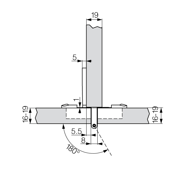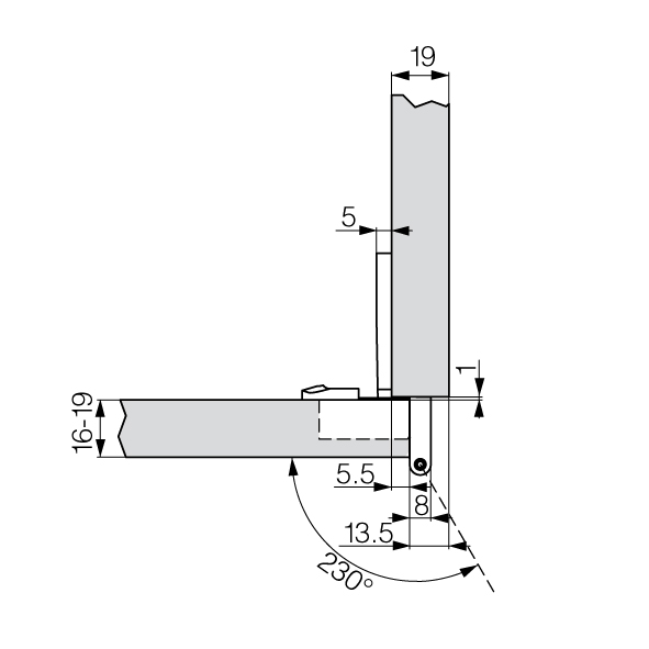 zinc mat nickelé, angle d'ouverture 230°, joint 8 / 13,5 mm, montage de porte par clips sans outils, réglage latéral - 2 mm, réglage en hauteur par trous oblongs +/-2 mm