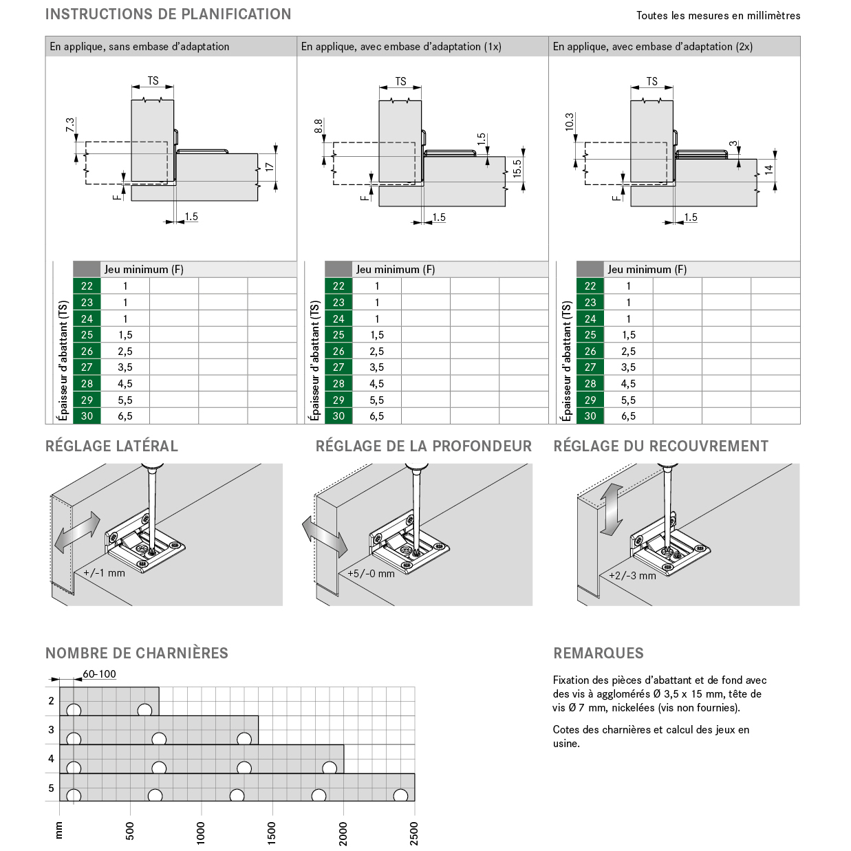 Zamak nickelé ou noir, design moderne avec joint gabarit étroit, Tipmatic compatible, poids de la porte max. 12 kilos, angle d'ouverture 90°, réglage latéral ± 1 mm, réglage en profondeur + 5 / - 0 mm, réglage du support + 2 / - 3 mm, support haut jusqu'à 19 mm, ne convient pas pour les volets s'ouvrant vers le haut, sans cache protecteur, sans plaque adapteur