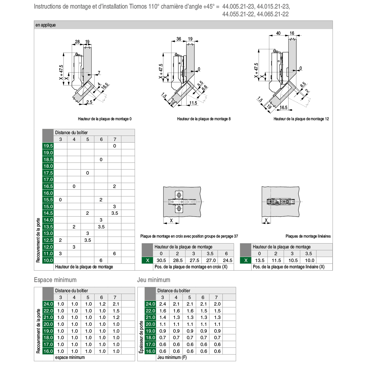 Charnière invisible GRASS® Tiomos 110° Click-on, pour corps biseautés à +45°, gabarit de perçage 45 / 9,5