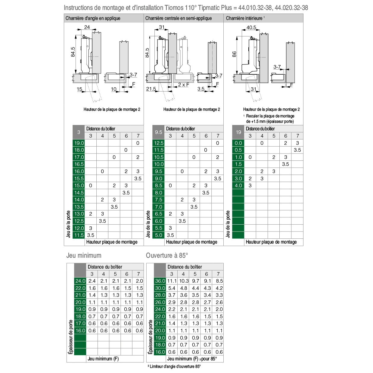 Charnière invisible GRASS® Tiomos 110° Tipmatic plus Click-on, gabarit de perçage 45 / 9,5