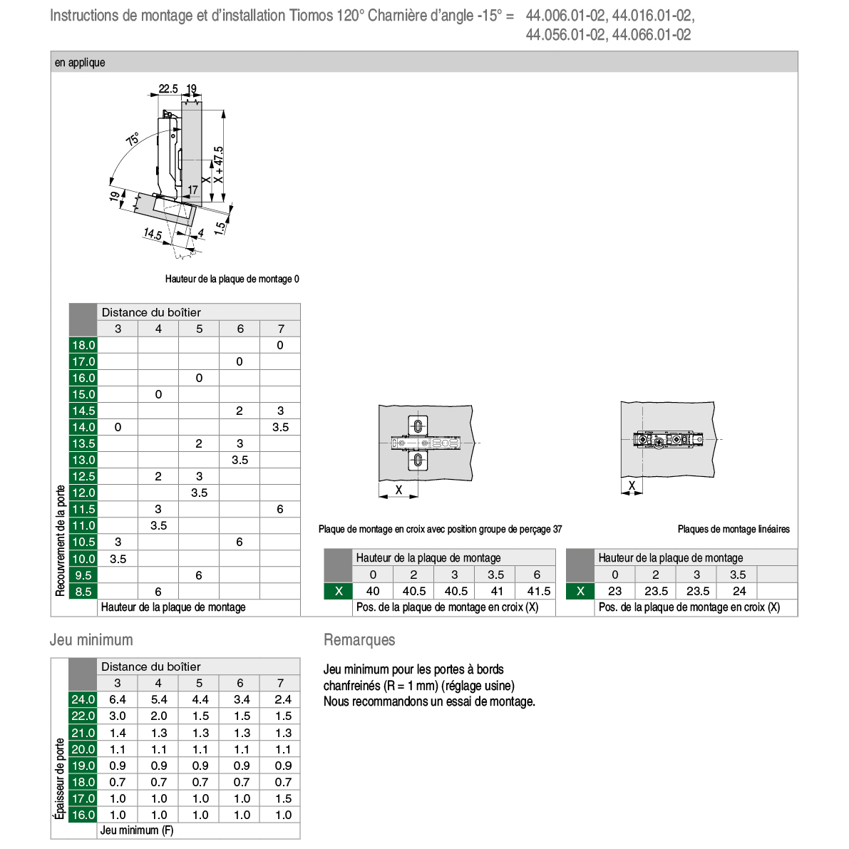 Charnière invisible GRASS® Tiomos 120° Click-on, pour corps biseautés à -15°, gabarit de perçage 45 / 9,5