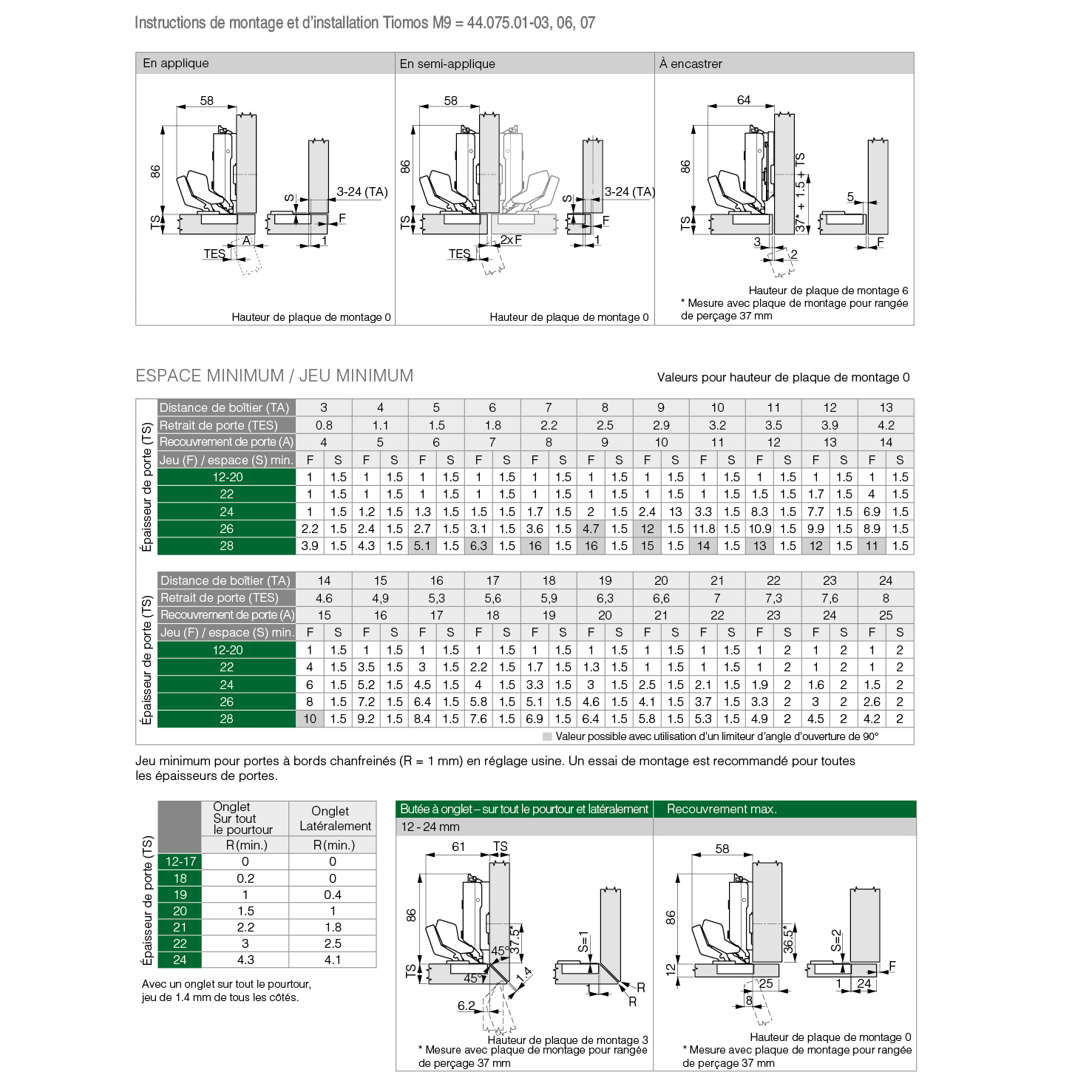 Charnière invisible GRASS® Tiomos M9 110° Click-on, pour portes de meubles mince et butée à onglet 45°, image de perçage 45 / 9,5