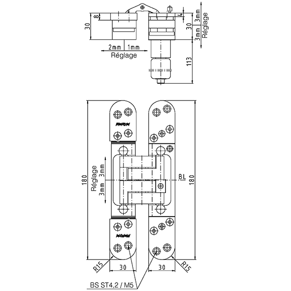Châssis aluminium, platines acier, pour portes noyées, avec la porte fermée, la bande est invisible, réglage tridimensionnel, sans entretien, la paumelle est amortie fermeture automatique par mécanisme de fermeture intégré, hydraulique, dissimulé, avec vis visibles, avec vis visibles, avec vis de montage, force portante avec 2 fiches env. 80 kg,