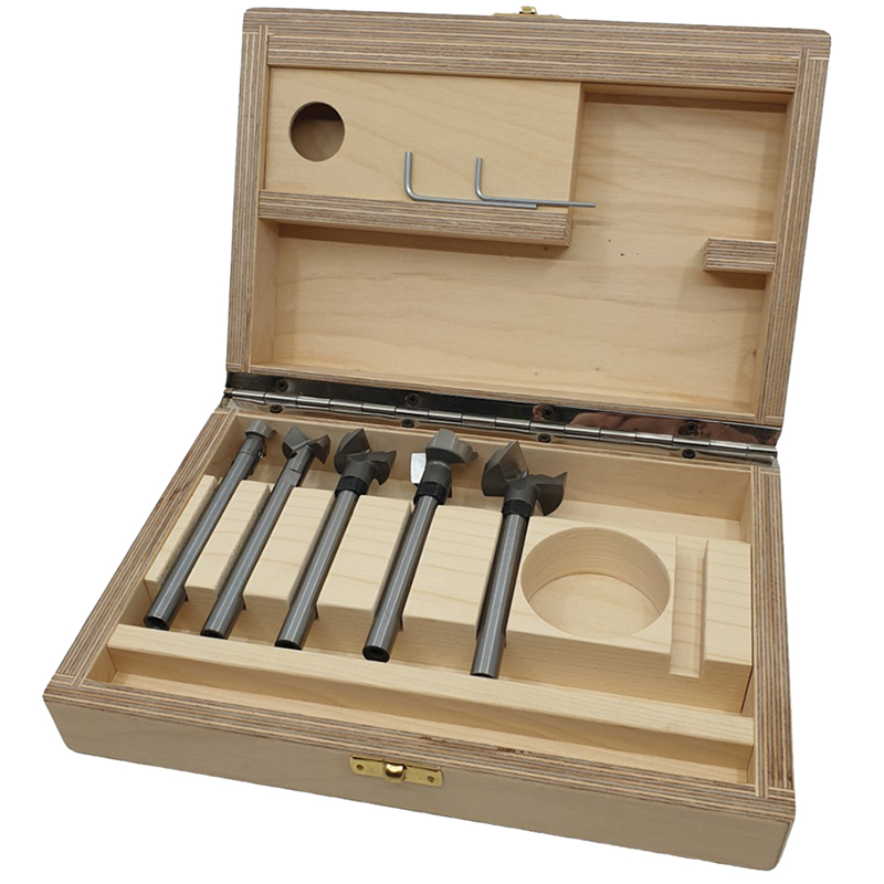 contenu: 1 pièce de chaque, mèches pour trous de noeuds Ø 15, Ø 20, Ø 25, Ø 30, Ø 35 mm, rallonge 125 mm, clé, dans une cassette en bois