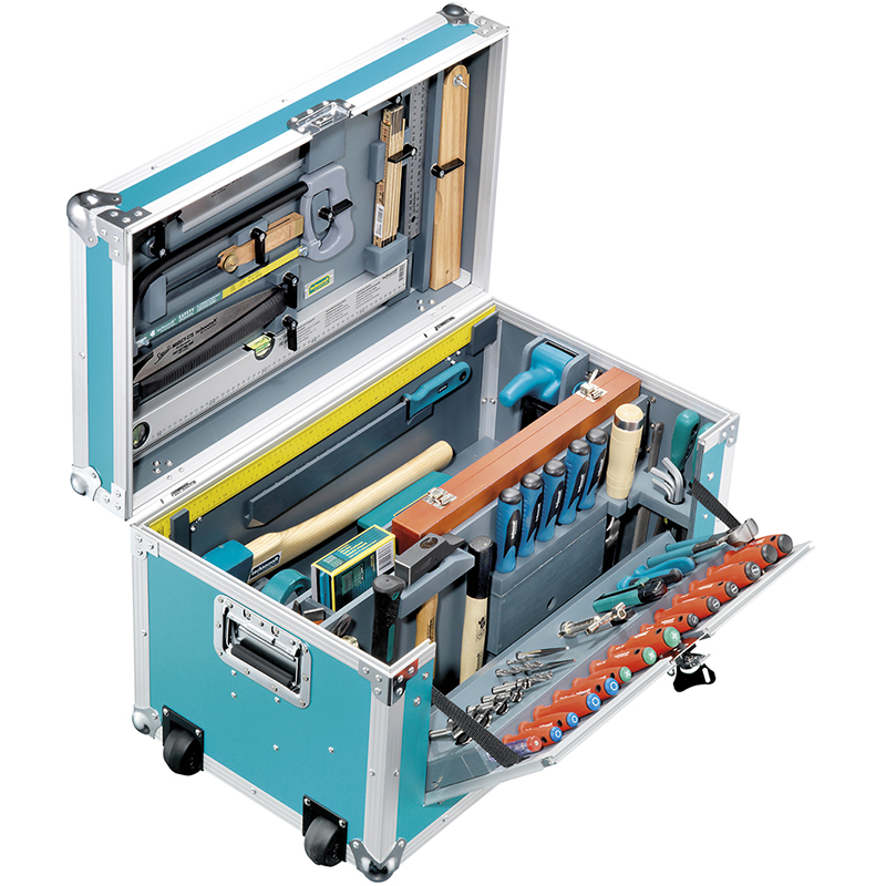 Boîte à outils légère de charpentier, largement équipée de 184 outils, grâce aux roulettes intégrées et à l'espace supplémentaire aménagé pour des outils électriques, la boîte à outils est idéale pour les fourgons de réparation, les chantiers, ou les postes de montage, tiroirs supplémentaires pour de petites pièces, séparations fixes pour outils qui contribuent à un ordre maximal et à un bon contrôle, boîte livrée avec cadenas, supportant jusqu'à 100 kilos