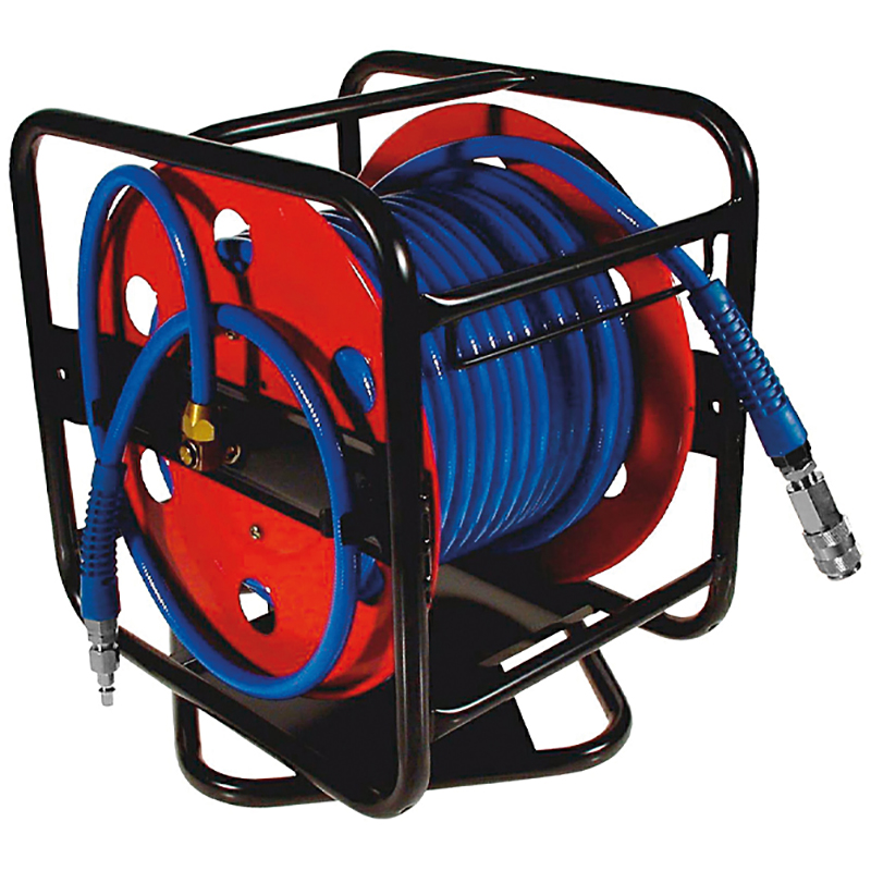 Dévidoir sur support métallique robuste, tournant, avec tuyau anti-pliures en polyuréthane et accouplement rapide, intérieur du tuyau 9,5 mm, chute de pression minime, tuyau de raccordement de 1 m, raccords ¼"