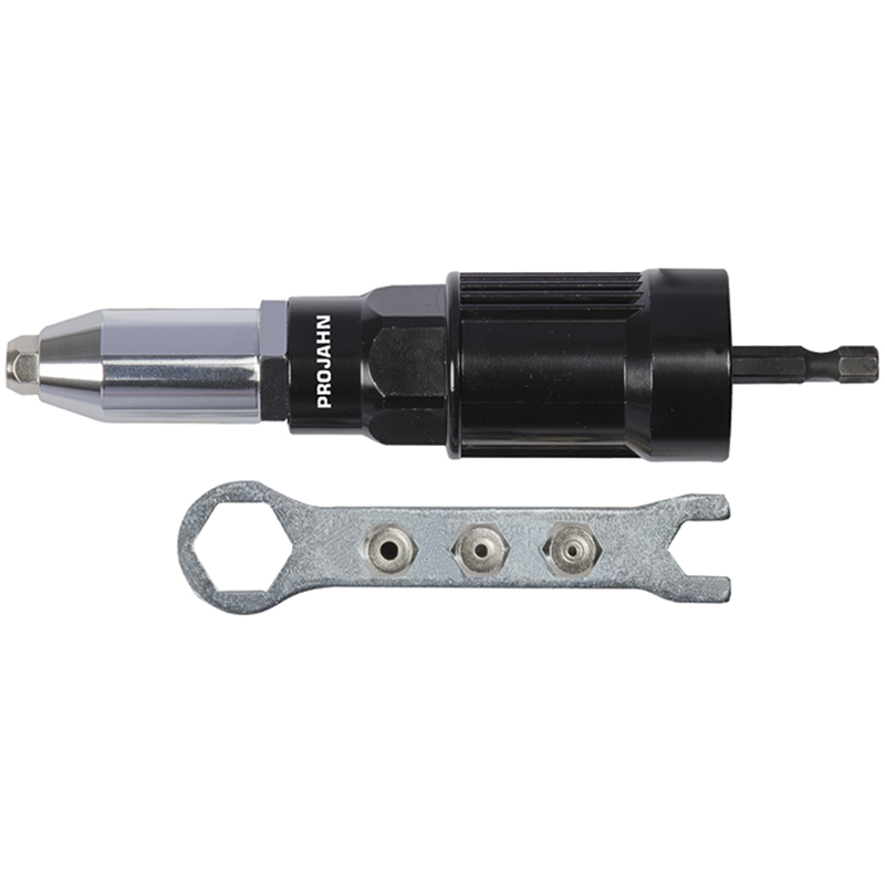 pour la pose de rivets borgnes avec des visseuses sur accus ou perceuses, emmanchement à 6 pans ¼", pose rapide et facile de rivets borgnes, compatibles avec tous les mandrins usuels sur le marché, mors en acier trempé, avec clef pour le changement d'embouts et au total 4 embouts