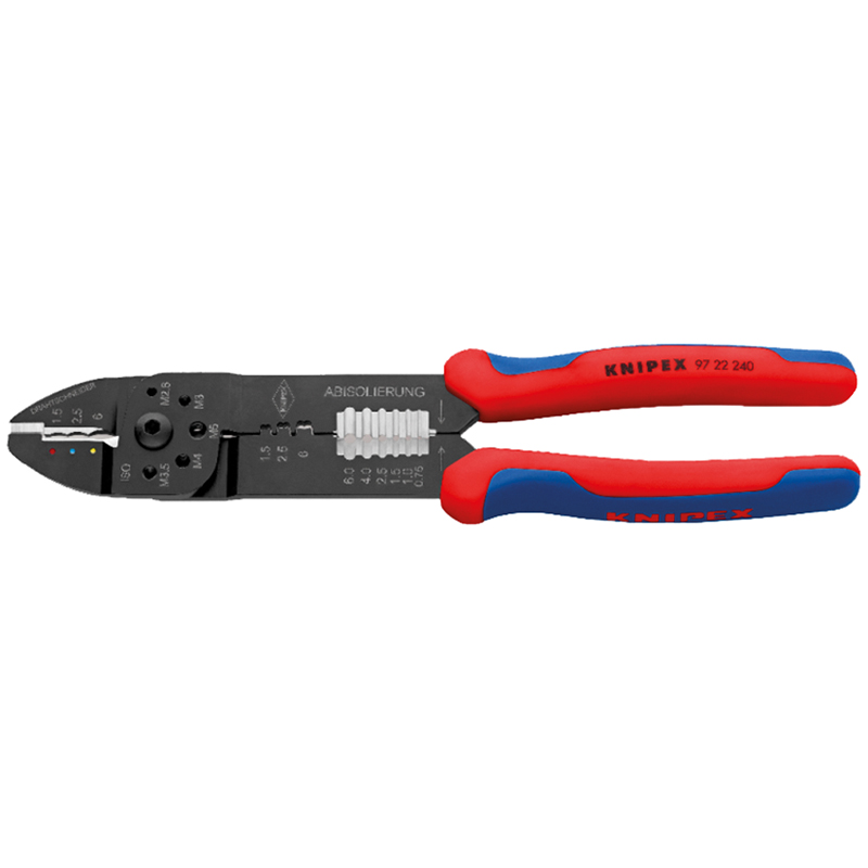 zum Kabelschneiden, Abisolieren von Adern und Crimpen von isolierten Kabelschuhen und isolierten Schrumpfschlauchverbindern sowie unisolierten, offenen Steckverbindern, mit Gewindelöchern zum Abschneiden von Cu- oder Ms-Gewindestiften mit M2,6, M3, M3,5, M4 und M5, geschraubtes Gelenk für eine hohe Stabilität und gleichmässigen Lauf