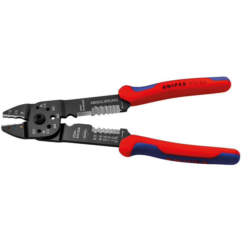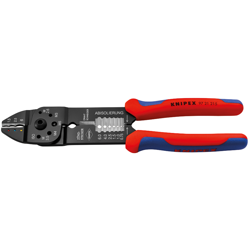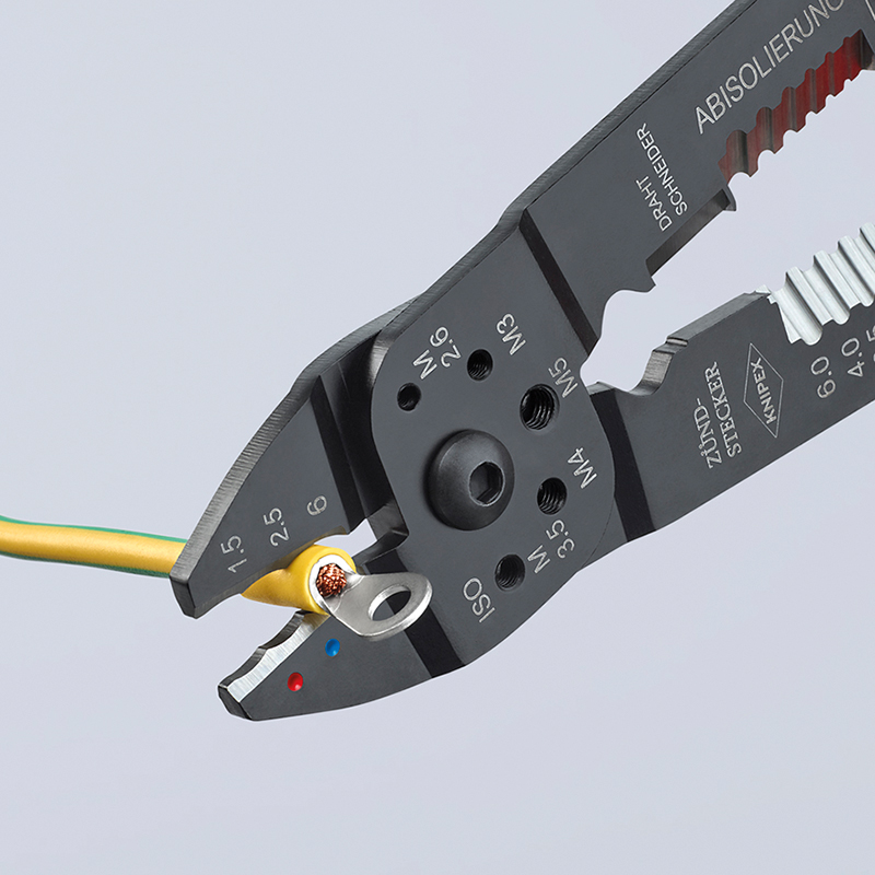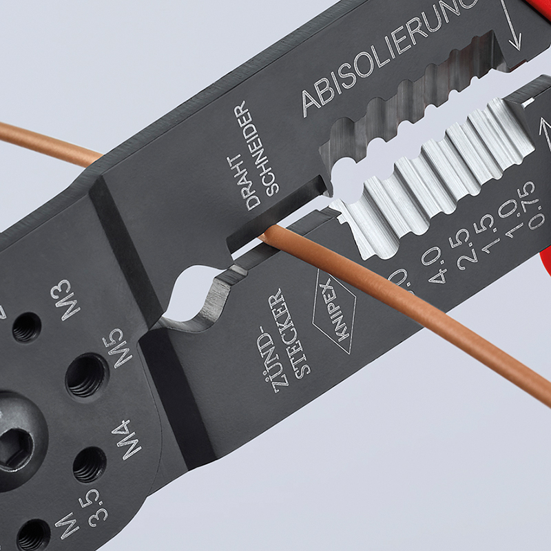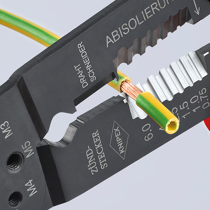 pour couper et dénuder les câbles et pour sertir les cosses et les connecteurs isolés, non isolés et les connecteurs ouverts, avec trous filetés pour la coupe de tiges filetées en cuivre ou en laiton M 2,6; M 3; M 3,5; M 4 et M 5, plus de stabilité et mouvement sans à-coups grâce à la charnière vissée