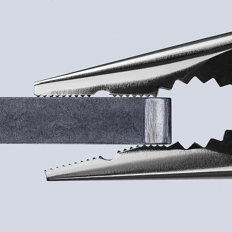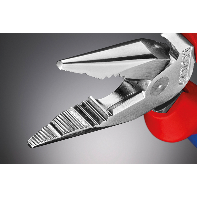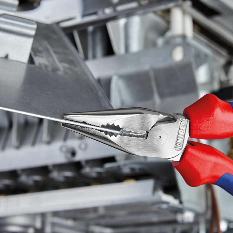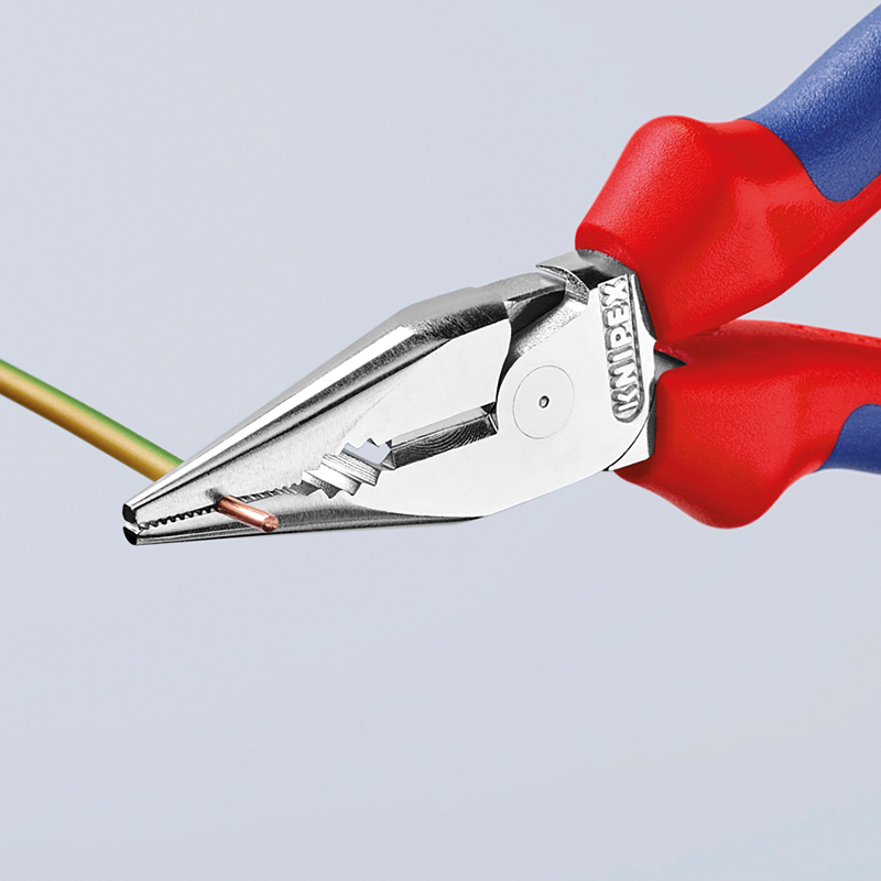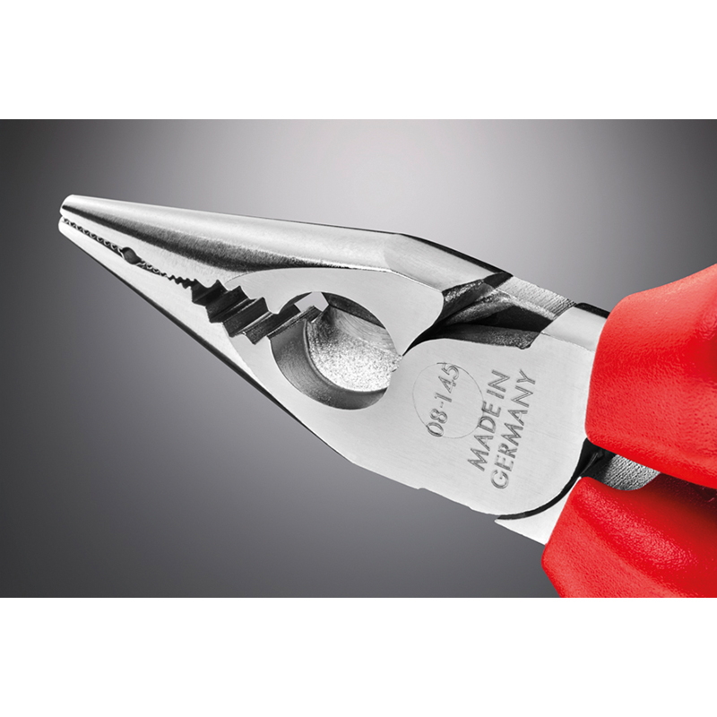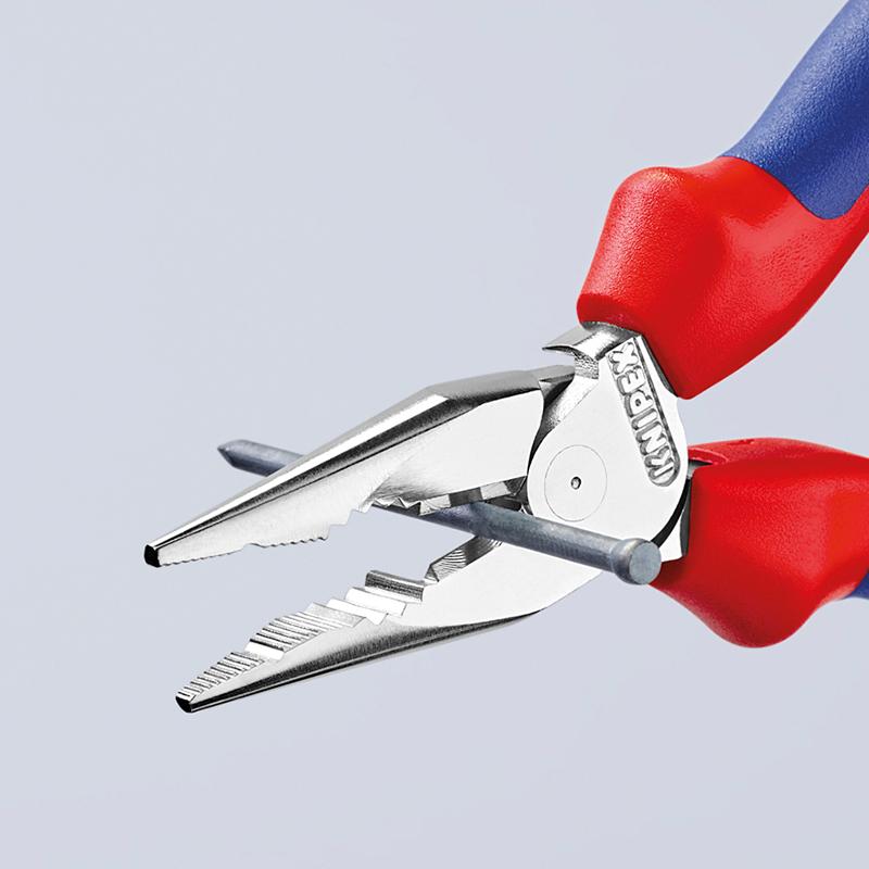 Pince universelle compacte à forte démultiplication à mâchoires en pointe, pour tous travaux usuels d’installation et de réparation, maniable pour travailler dans des zones difficiles d’accès grâce à la forme effilée de sa tête, à mâchoires en pointe (protection anti-inversion), mors à contour convexe d‘un côté pour saisie en toute sécurité de pièces plates, rainurage fraisé dans la zone de préhension, permettant de bien maintenir et tirer de petites pièces, telles que pointes, clous et boulons, la pince universelle multifonctions fiable et polyvalente des nomades, coupe facile grâce à son articulation à forte démultiplication, avec tranchants pour fils doux, mi-durs et durs, tranchants trempés par induction, dureté d'env. 61 HRC, grande longévité et becs solides, forgé en acier à outil spécial de haute qualité, trempé à l'huile en plusieurs phases, Poignées multi-composants
