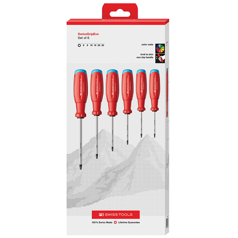 manche tri-composant SwissGrip Evo optimisé et résistant aux chocs pour une ergonomie maximale, une transmission de force maximale et des couples inégalés, lame en alliage spécial de haute qualité à base d'acier à ressort pour une élasticité exceptionnelle et une grande dureté, 6 pièces, dans un coffret en carton de haute qualité
