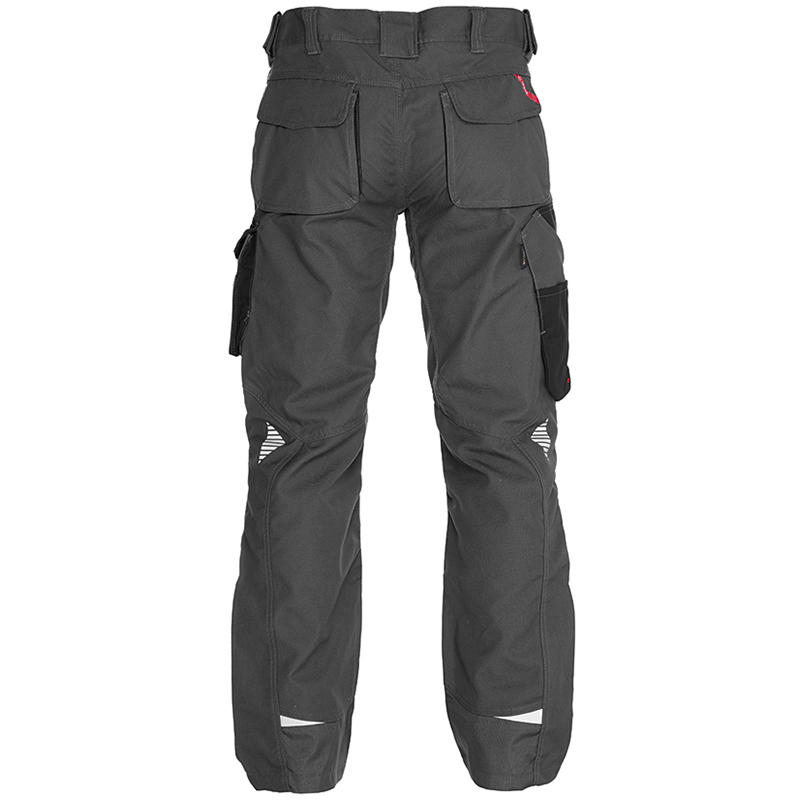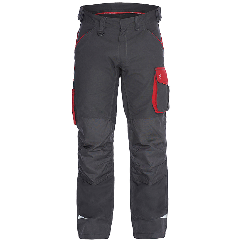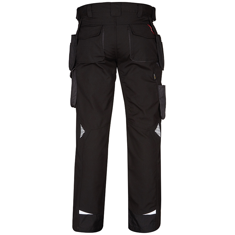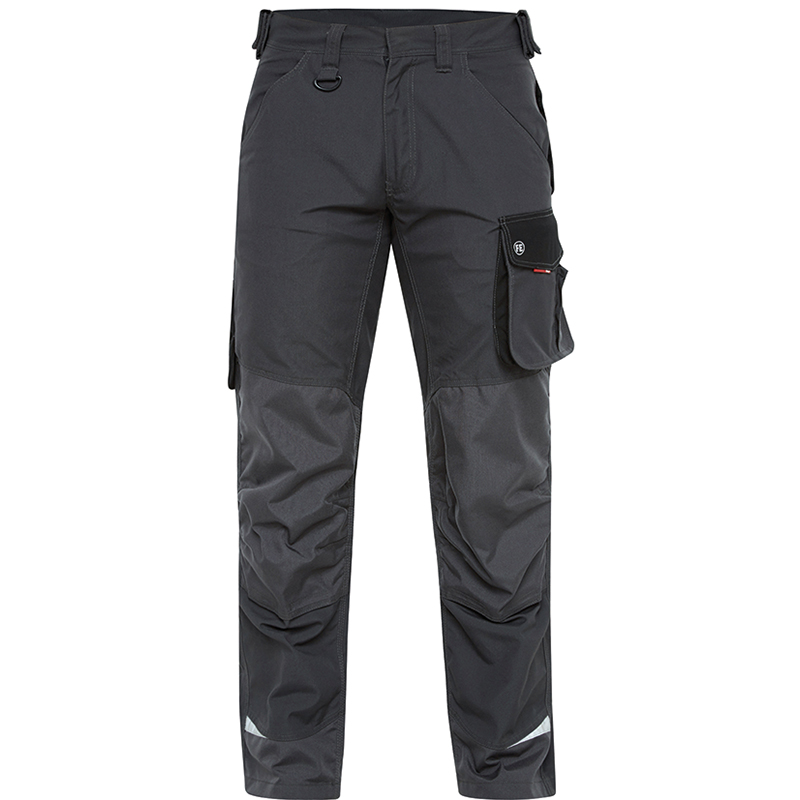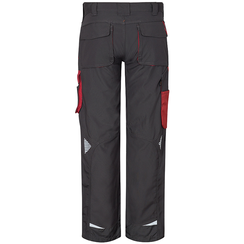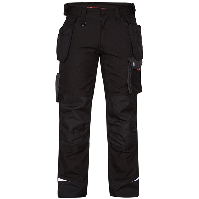 genou de forme ergonomique, nombreuses poches fonctionnelles, entre autres poche cuisse avec poche zippée, deux possibilités de réglage pour la genouillère, genou et bas de pantalon renforcés CORDURA®, fond pendant libre sur poche cuisse et poche mètre, bride avec anneau en D, supporte un lavage industriel