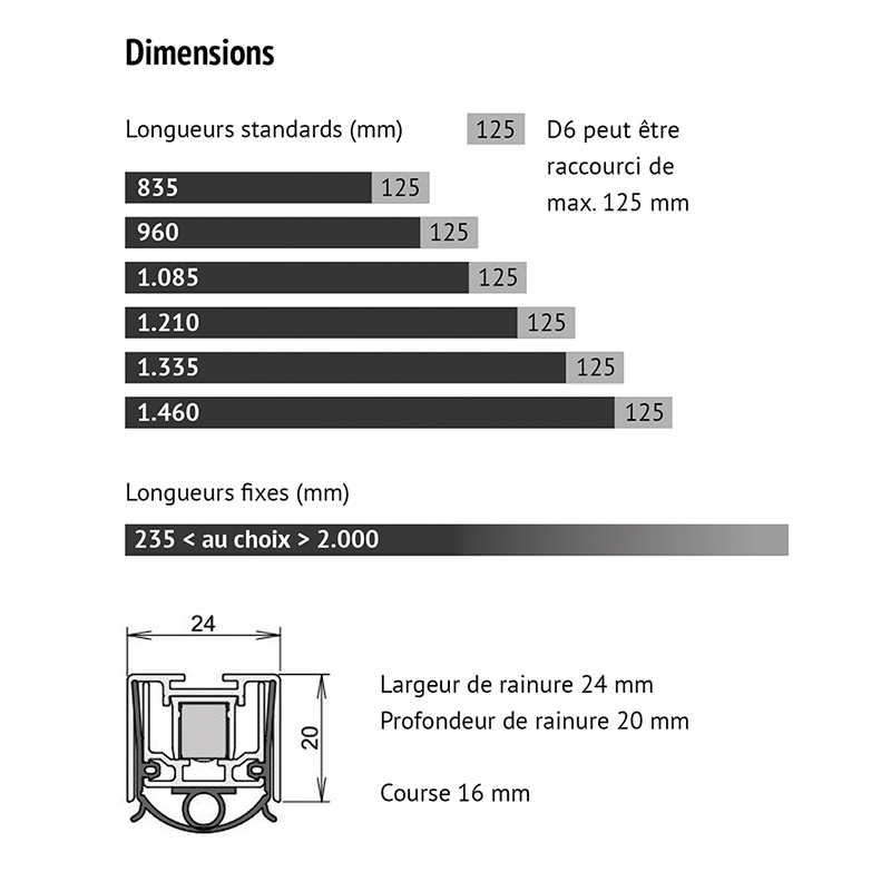 Pour portes extérieures étanches à la pluie battante 7A selon EN 1027, à rainurer pour rainure de 24 x 20 mm, déclenchement côté paumelle, profilé d'étanchéité en silicone auto-extinguible, jusqu'à 51 dB de valeur d'isolation acoustique, butée avec équerres de fixation frontales en acier inoxydable, joint latéral de feuillure d'huisserie pour l'étanchéité des fentes d'aération de sol jusqu'à 16 mm