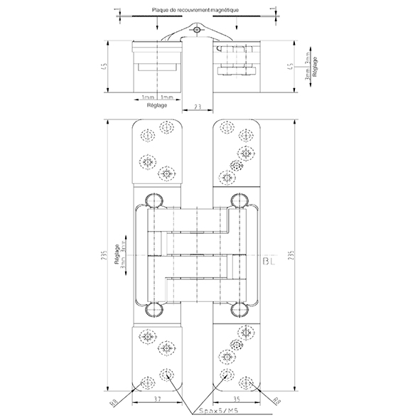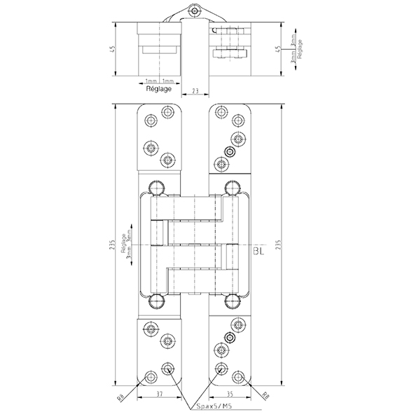 Châssis acier, platines acier, pour portes noyées, avec la porte fermée, la bande est invisible, réglage tridimensionnel, sans entretien, avec vis visibles ou modèle Design, pour l'utilisation sur des portes dans des voies d'évacuation et de secours avec des exigences en matière de protection contre la fumée et l'incendie, sans vis, force portante avec 2 fiches env. 200 kg