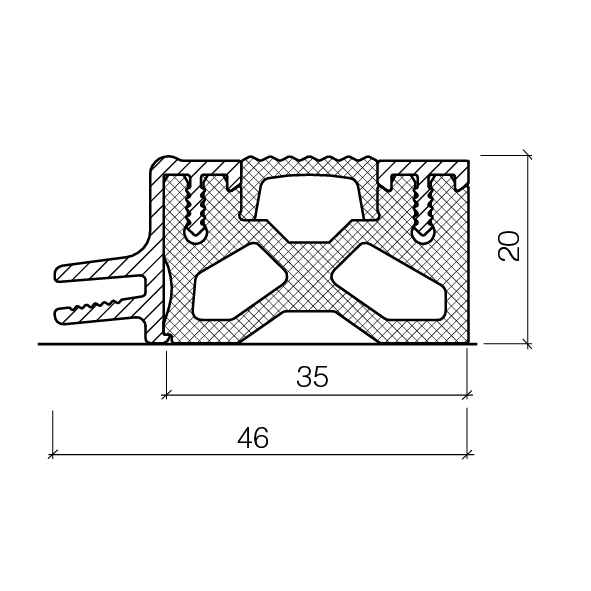 Aluminium, non percé, seuil thermique en 2 parties, profilé de base avec isolateur en plastique gris, profil de couverture en TPE, utilisation de joints de frottement et de joints d'abaissement possible grâce au "nez" enlevé, avec rainure d'étanchéité pour cordon rond enfichable sous le profilé de seuil, conforme à la norme SIA 271, profilé enfichable à clipser, accessible en fauteuil roulant