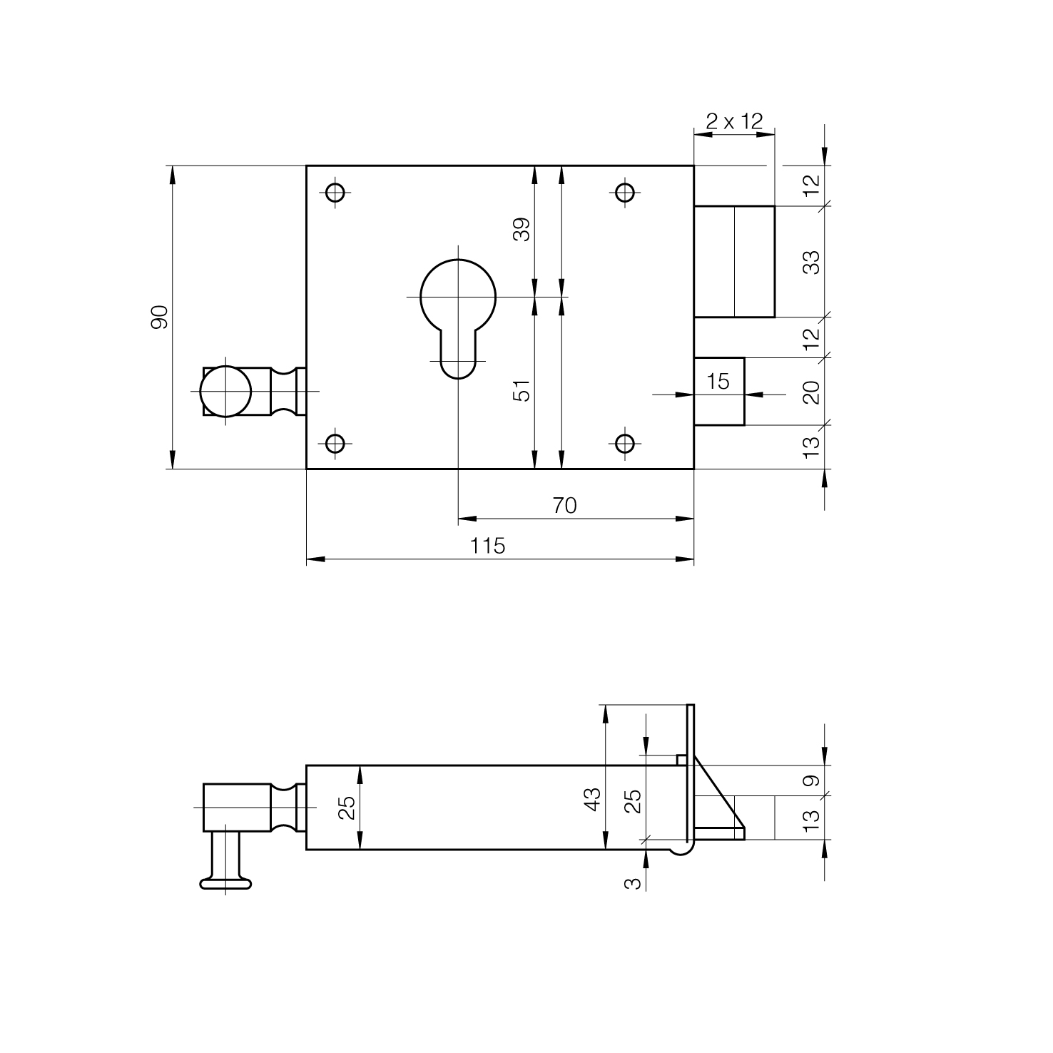 Acier galvanisé, bec-de-cane en laiton, bouton déco en laiton nickelé, verrou 2 tours, avance de verrou 24 mm, taille de palastre 115 x 90 x 25 mm, avec gâche pour recouvrement 20 mm pour portes s'ouvrant vers l'intérieur