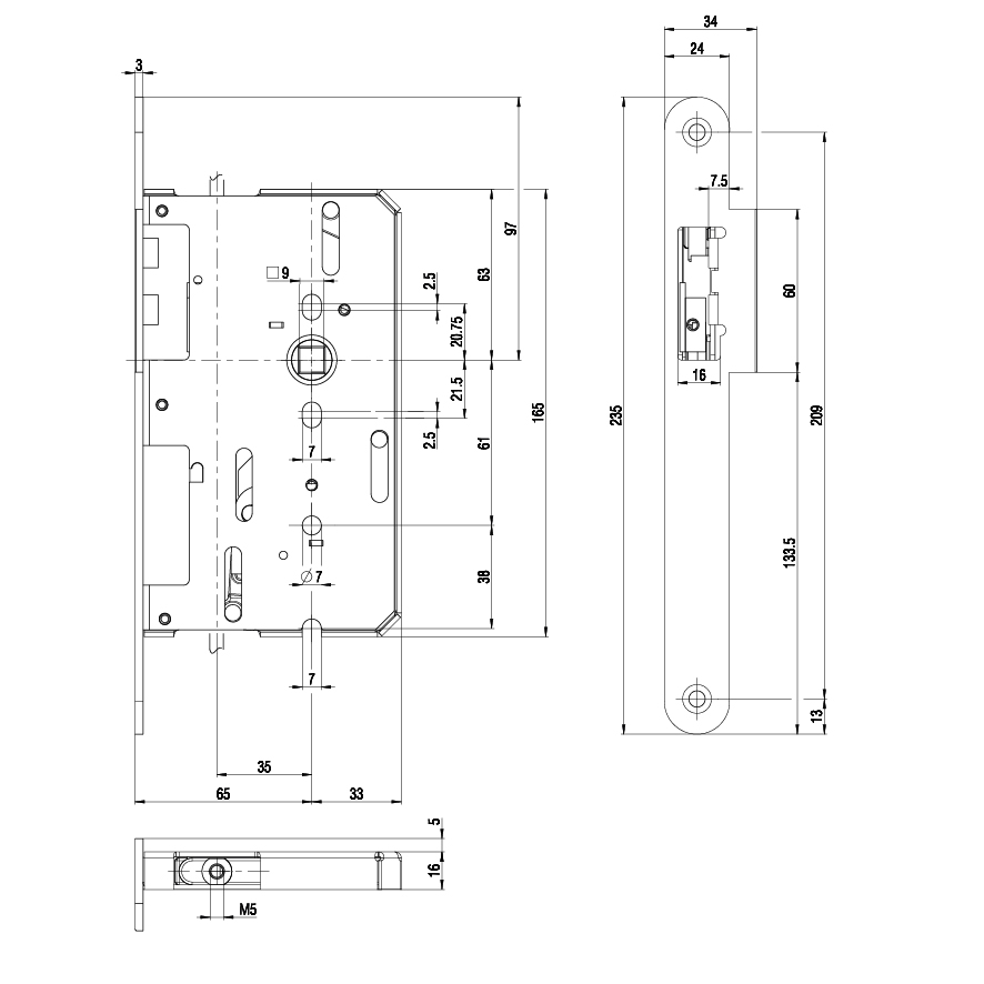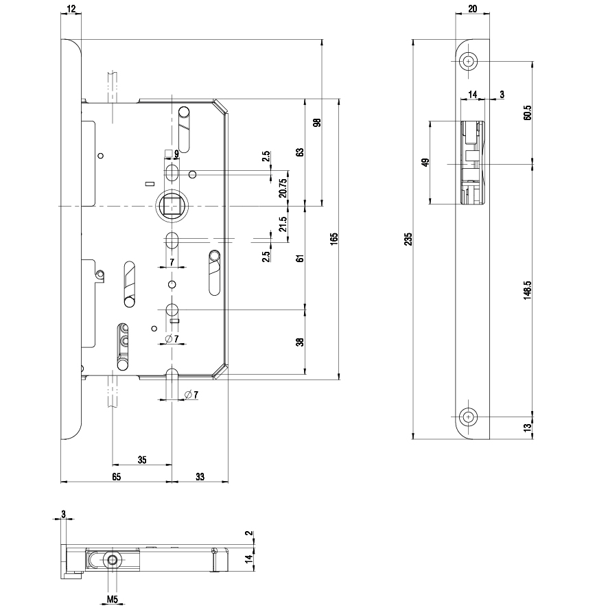 pour le verrouillage automatique du vantail dormant sur portes d'issue de secours à 2 vantaux, testée selon DIN EN 179 / EN 1125, avec raccord de tige M5 pour verrouillage supérieur et M6 pour l'inférieur, distance au canon 65 mm, têtière inox mat, fouillot 9 mm, du milieu du fouillot au rebord supérieur du palastre 63 mm