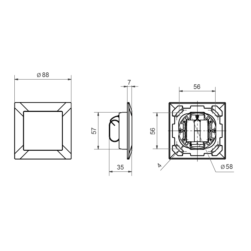 - Montage encastré en 1 bloc, dimensions 88 x 88 mm (plastic), 94 x 94 mm (autres)