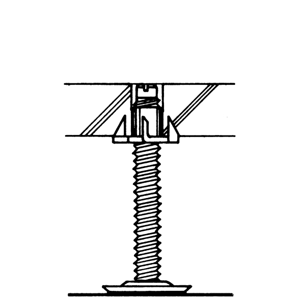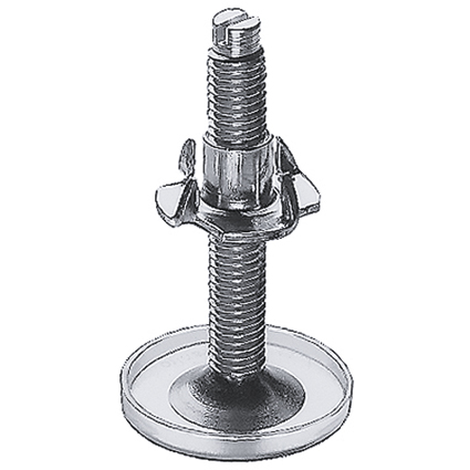 Stahl verzinkt, zum Ausgleich von Bodenunebenheiten, bestehend aus Einschlagmutter (Bohr-Ø 10 mm), Gewindeschraube M8, einseitig mit Schraubenschlitz, anderseitig mit beweglicher Bodenplatte Ø 30 mm und Schutzkappe aus Kunststoff