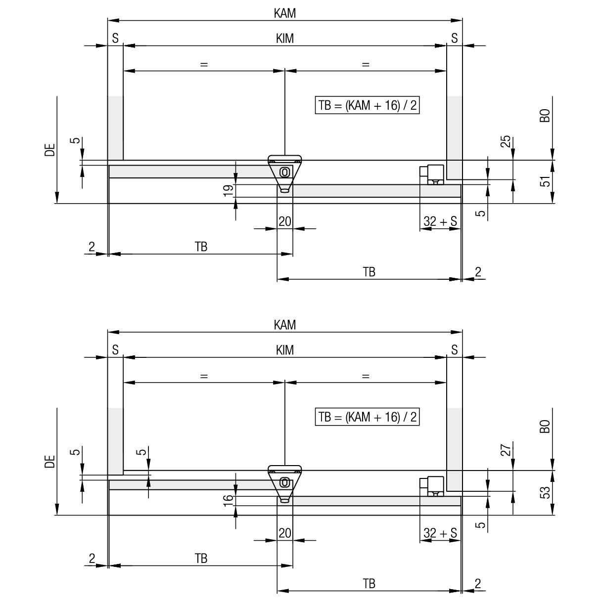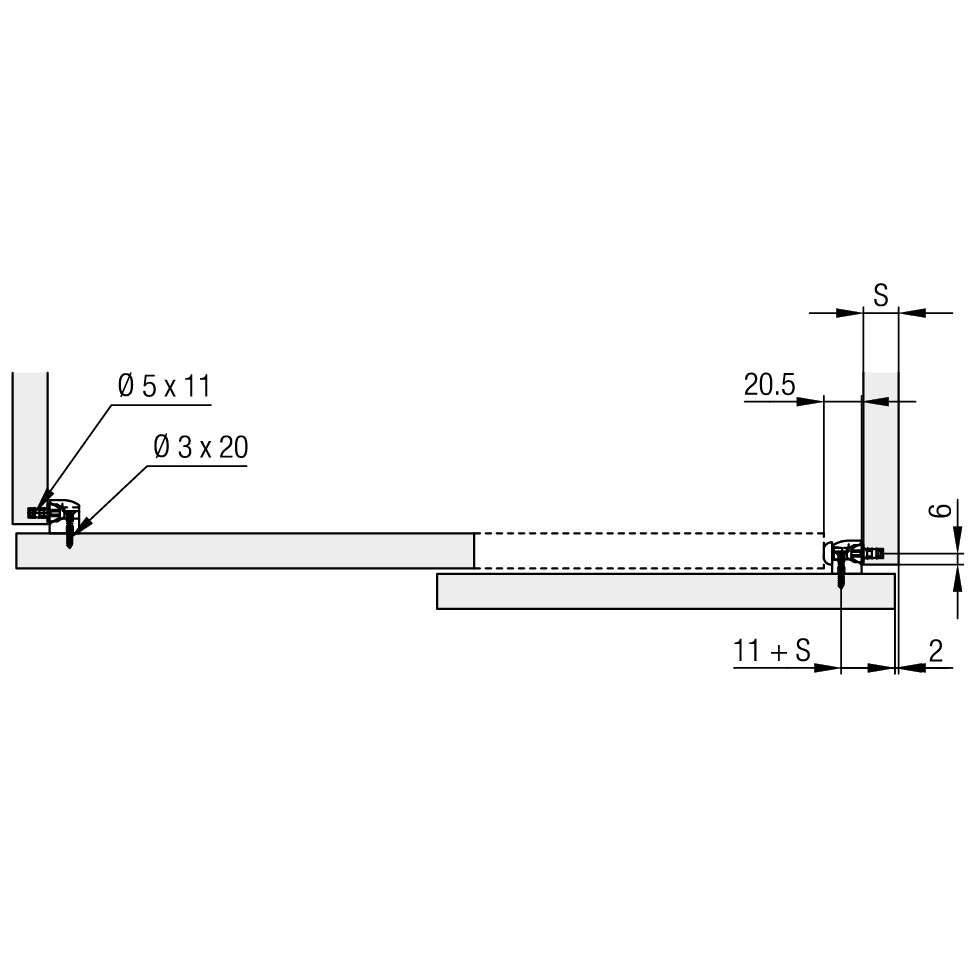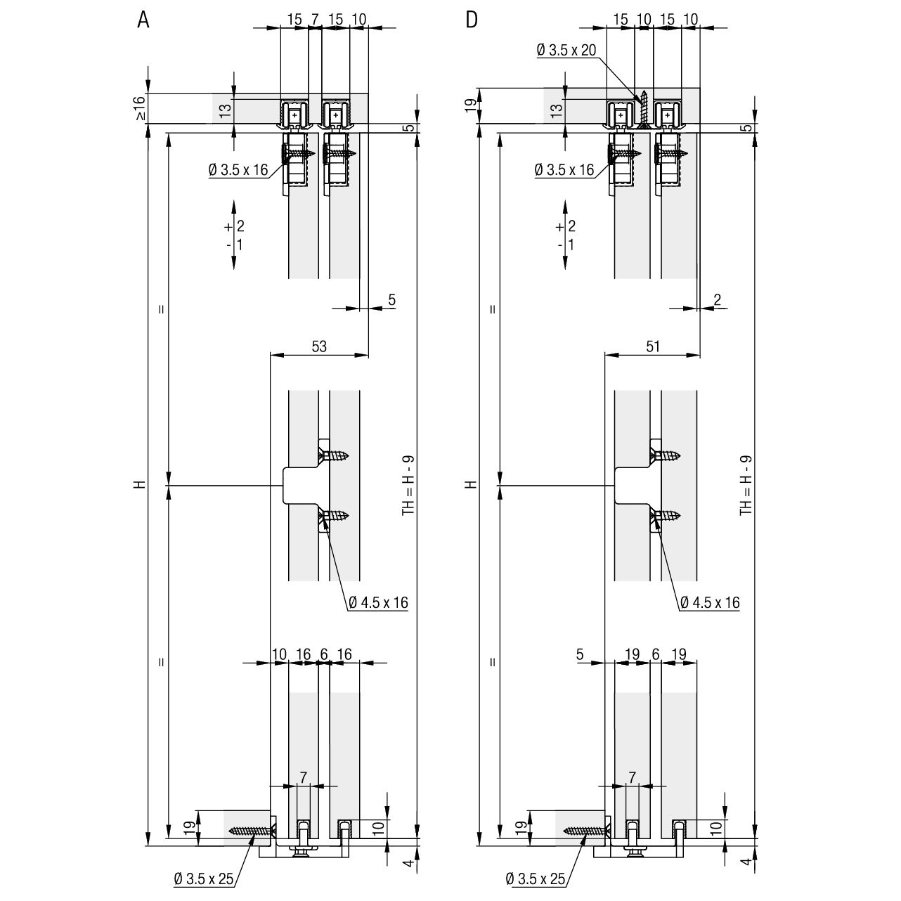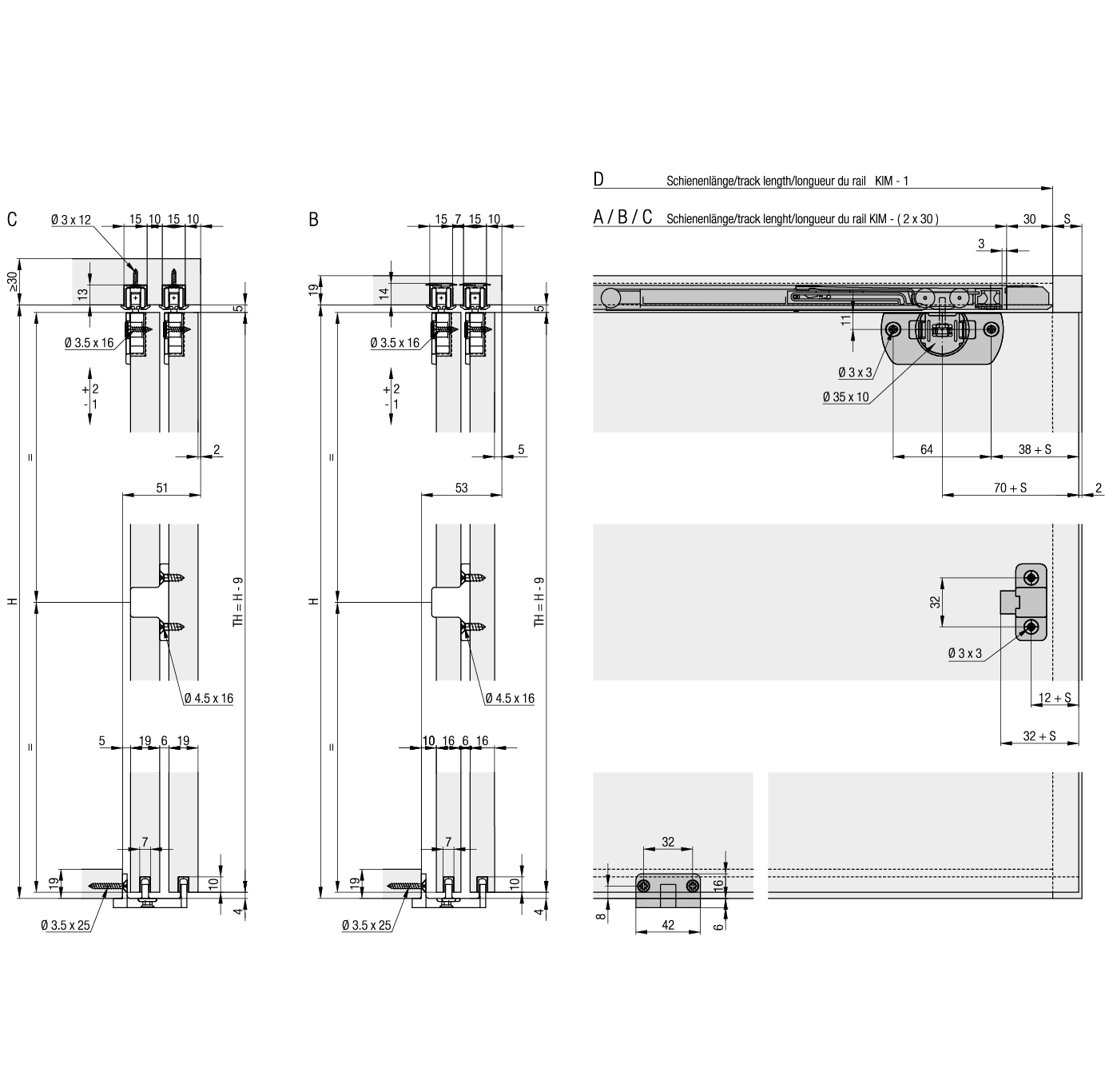 pour portes d'armoire coulissantes en bois jusqu'à 16 kg, entrant dans le corps en haut et devant le corps en bas, dimensions porte (largeur x hauteur) max. 1000 x 1400 mm, épaisseur de porte 16 - 19 mm, chariot à clipser, sans rails de roulement, sans accessoires