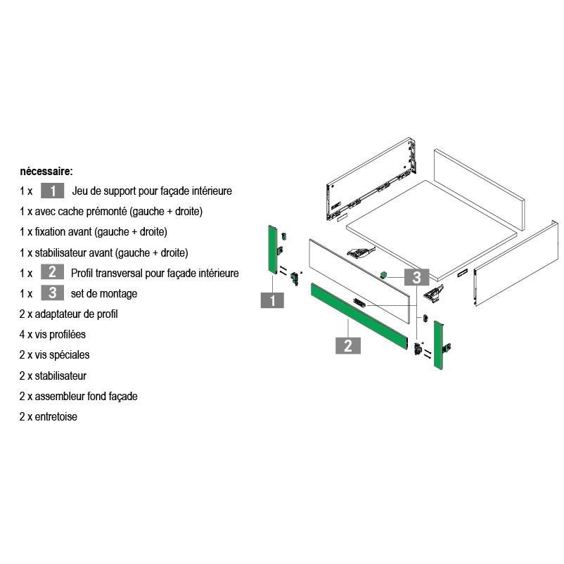 - Raccord de fond pour largeur du tiroir dès 600 mm 58.274.41 est recommandé.