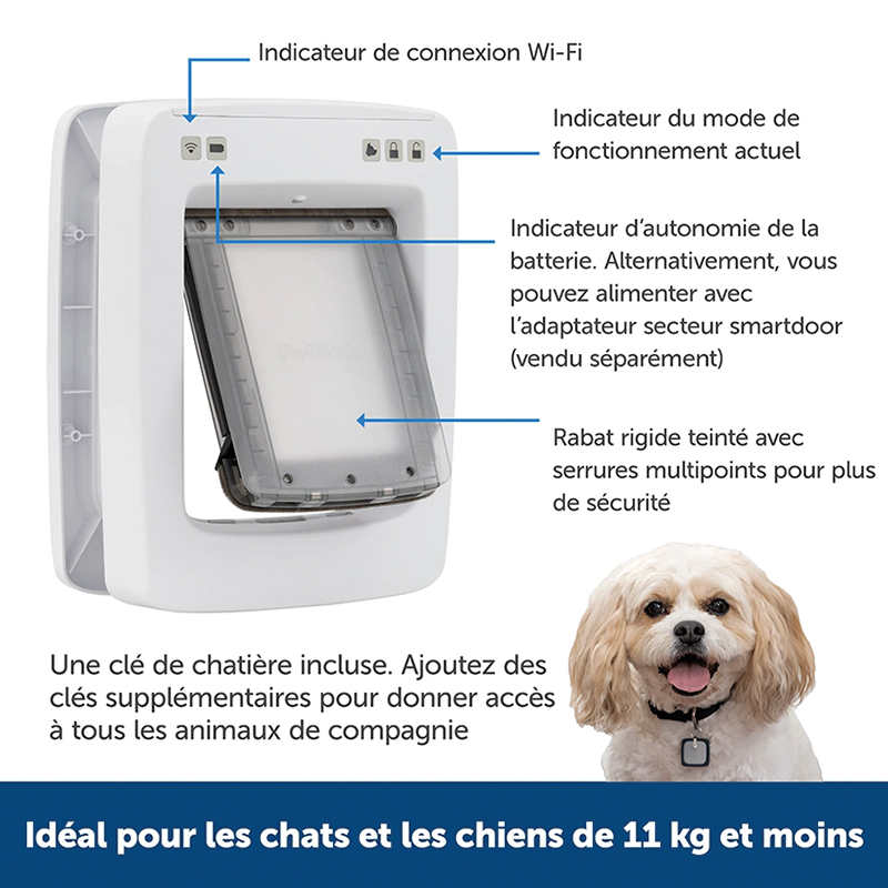 Porte pour animaux domestiques innovante, contrôlée par une application, permettant aux animaux d'entrer et de sortir librement, la fonction d'entrée et de sortie sélective permet de déterminer quels animaux peuvent utiliser la porte afin de tenir les animaux sauvages à distance, la création ou l'adaptation de plusieurs horaires pour chaque animal domestique permet de maintenir leurs routines quotidiennes, la porte peut être verrouillée et déverrouillée de n'importe où et des notifications sont envoyées, lorsque les animaux de compagnie utilisent la porte, vous recevez en outre des mises à jour sur l'état de la batterie et plus encore, sûr et économe en énergie grâce à l'étanchéité dynamique aux intempéries et au mécanisme de verrouillage multipoint, la taille M est fournie avec une clé de porte pour animaux de compagnie de taille M qui peut être couplée à la micropuce de l'animal de compagnie, grâce à la séance d'entraînement guidée et à la vidéo, les animaux de compagnie peuvent utiliser la SmartDoor™ en 4 à 6 semaines sans aide,