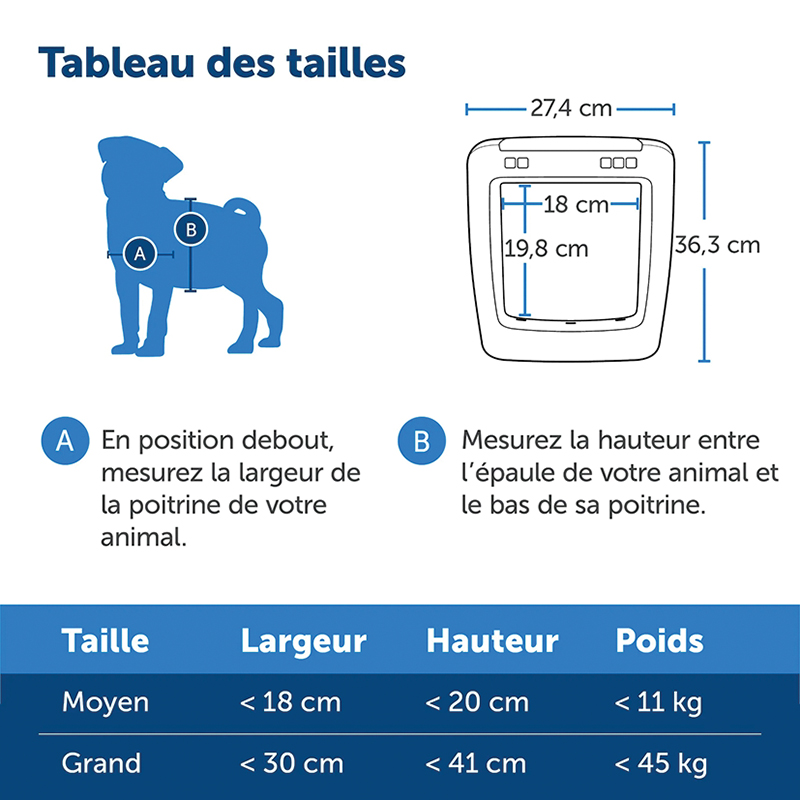 Accessoires fournis: cadre intérieur, cadre extérieur, 1x clé pour animaux domestiques de taille M, gabarits de découpe, 1 entretoise en plastique, instructions de montage, instructions d'entraînement pour les animaux domestiques, vis, bouchons de fermeture