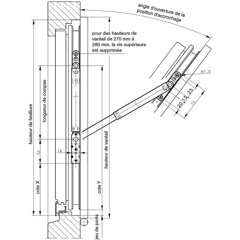 angle d'ouverture en position de nettoyage selon la hauteur du vantail,
