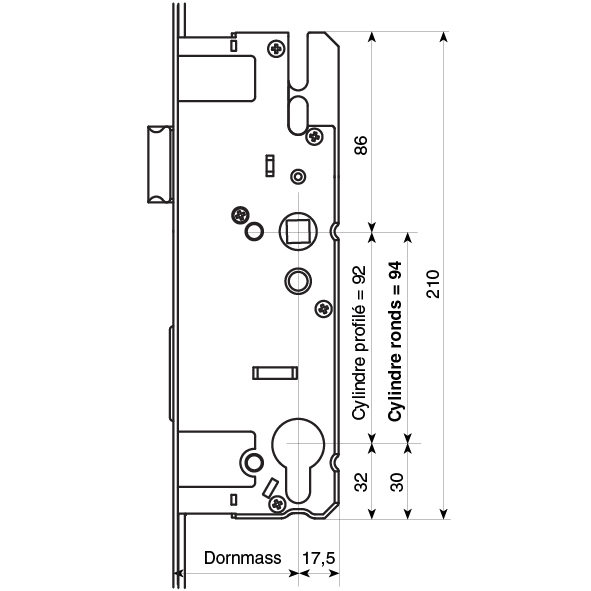 couleur argent, avec rouleau à galet (RS), largeur de la têtière 16 mm, avec pêne dormant, distance de sotie du pêne 17.5 mm, hauteur du boîtier de serrure 210 mm, Epaisseur du boîtier de serrure 16 mm, distance de découpe du cylindre rond 94 mm, Hauteur de la poignée 800 - 1000 mm, longueur de la têtière 1960 mm, le loquet peut être changé de droite à gauche