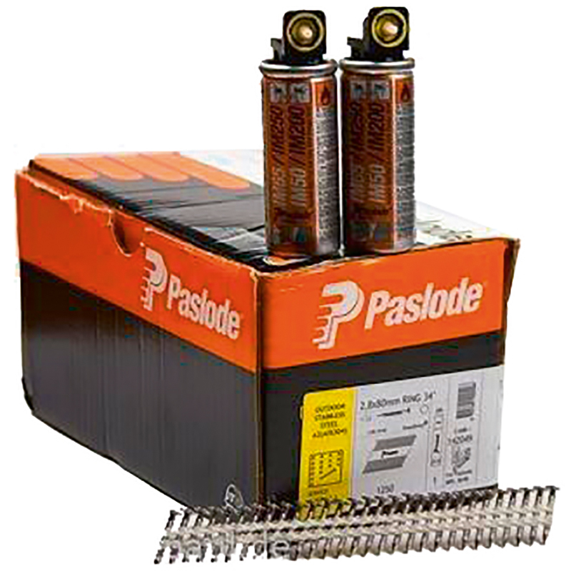 acier inox A2, strié, resiné, munitions à bandes, avec 2 cartouches à gaz, clous rainurés spéciales selon la norme DIN 1052, classe 3 de la capacité portante, pour cloueur de plombier IM200/32 Paslode