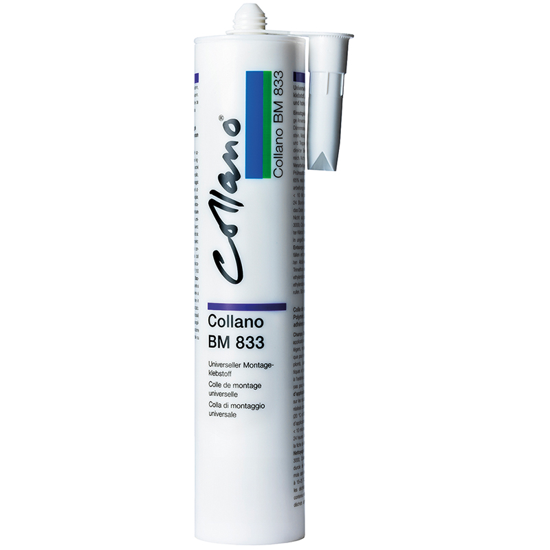 La colle de montage universelle pour les applications à l'intérieur et à l'extérieur, à l'abri des intempéries, Collano BM 833 s'applique facilement avec peu d'efforts avec sa buse en V et elle est aussi spatulable, le pouvoir de remplissage élevé permet de combler les joints épais, parfait pour un montage rapide et précis de corniches, de couvertures et autres, pour des applications de grandes surfaces, panneaux légers, matériaux d'isolation et calfeutrage ainsi que pour le verre, miroirs, pierre naturelle, métal, plomb, aluminium, diverses matières synthétiques et le montage d'escaliers, a l'intérieur et à l'extérieur, à l'abri des intempéries, ne convient pas pour le plexiglas, PP, PE, téflon.
