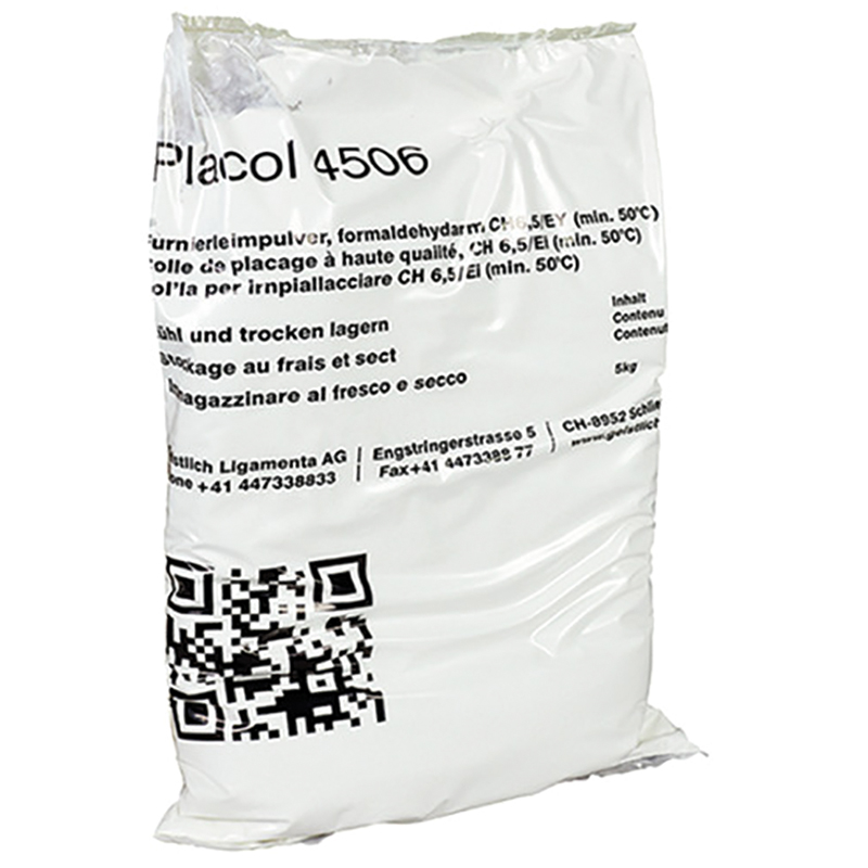 colle en poudre pour le placage à chaud dès 40 °C, résistante à l’eau, pauvre en formaldéhyde E1, excellentes propriétés de mouillage, en particulier pour les placages délicats (bouleau, érable, pin, etc.), l'ajout de colle blanche n'est donc plus nécessaire, pour la pose de panneaux de résine synthétique (HPL / CPL) sur matériaux dérivés du bois