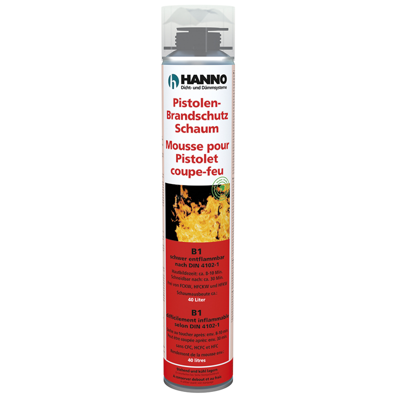Mousse de montage PUR, 1 composant, durcisseur résistant à l'humidité, mousse coupe-feu, difficilement inflammable, utilisé pour la prévention anti-feu en calfeutrant de manière bien isolée les joints de raccordement des fenêtres et des portes ainsi que pour le moussage de fissures murales et d'autres cavités, excellente adhérence sur pratiquement tous les matériaux de construction usuels, imputrescible, résistant au vieillissement, au gel et à des températures de -40° C à +80° C respectivement à court terme +120° C, pendant de courtes périodes, dimensionnellement stable, sans pression de maintien et isolant thermique, remplissant les exigences selon DIN 4102 B1, peut supporter une charge après env. 3 heures, résistance au feu certifiée de joints de construction EI 90 / EI 120
