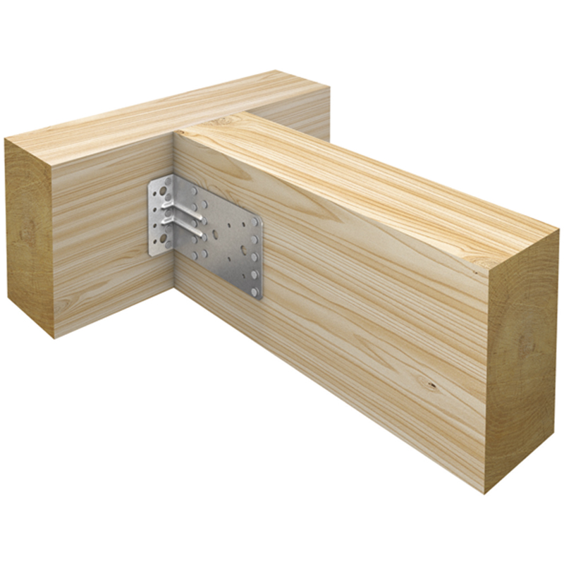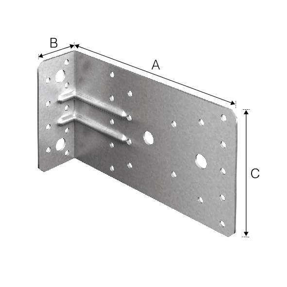 Tôle d'acier galvanisé à chaud, avec perforation par clou et boulon, pour les raccords de poutres se croisant, comme fixation de chevrons à des pannes ou comme ancrage de traction par une branche longue, clou supérieur à 160 mm