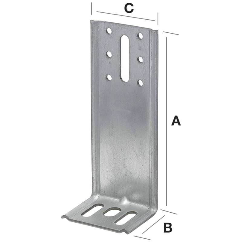 Tôle d'acier galvanisée à chaud, particulièrement adaptée au montage à distance de constructions en bois sur du béton / de la maçonnerie, liaison directe de la construction au support, crée un niveau d'isolation et une ventilation arrière, particulièrement stable dimensionnellement grâce aux nervures latérales, compensation des inégalités dues au trou oblong,
