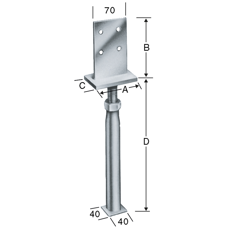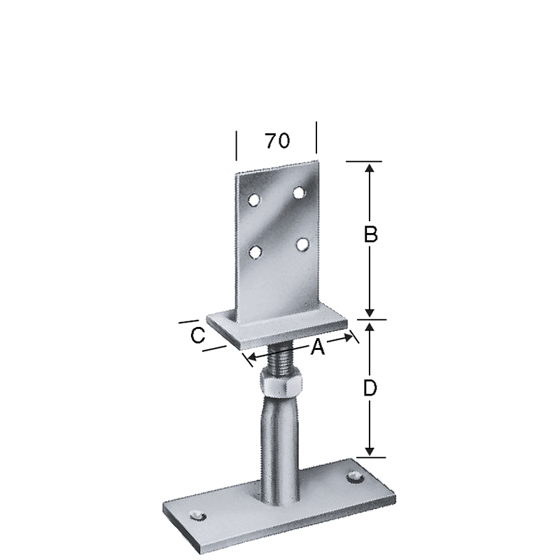 Acier galvanisé à chaud, à bétonner ou à visser, le raccordement des appuis s'effectue avec des pointes d'ancrage CNA Ø 5 mm ou à des fins constructives avec un boulon ou un tourillon Ø 8 mm
